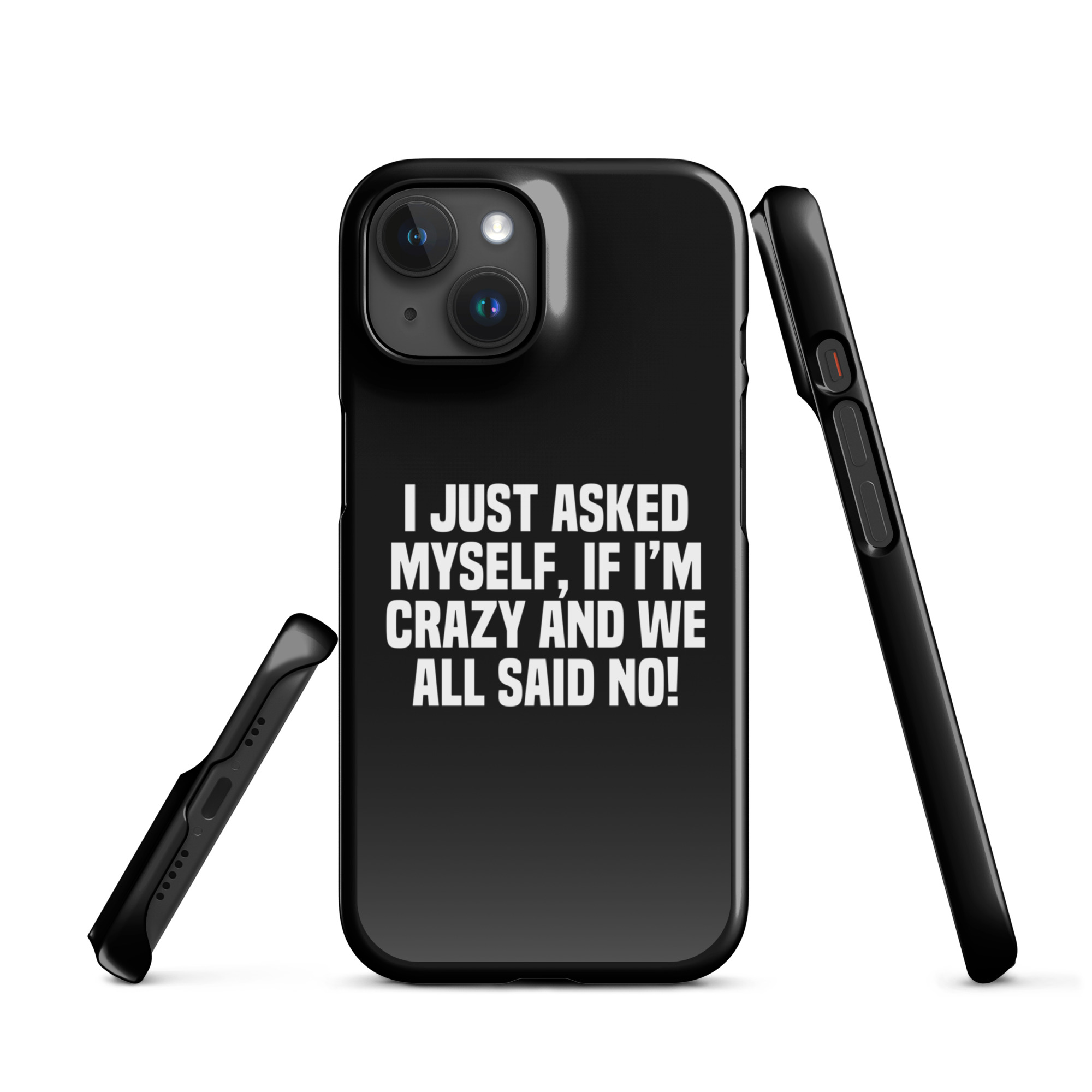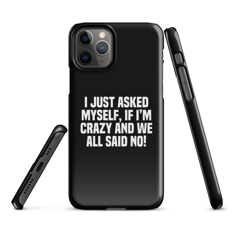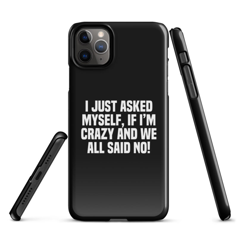 Manchmal muss man sich selbst die entscheidenden Fragen stellen – und die besten Antworten bekommt man bekanntlich von sich selbst! Mit dem Spruch „I just asked myself if I’m crazy, and we all said no!“ bringst du deinen einzigartigen Humor zum Ausdruck. Dieses Design zeigt auf witzige Weise, wie herrlich verrückt das Leben sein kann. Perfekt für alle, die ihre Selbstironie feiern und ihren etwas schrägen Humor gerne offen zeigen. Es ist die charmante Erinnerung daran, dass ein wenig Wahnsinn in uns allen steckt – aber hey, wir alle haben zugestimmt, dass es völlig normal ist!