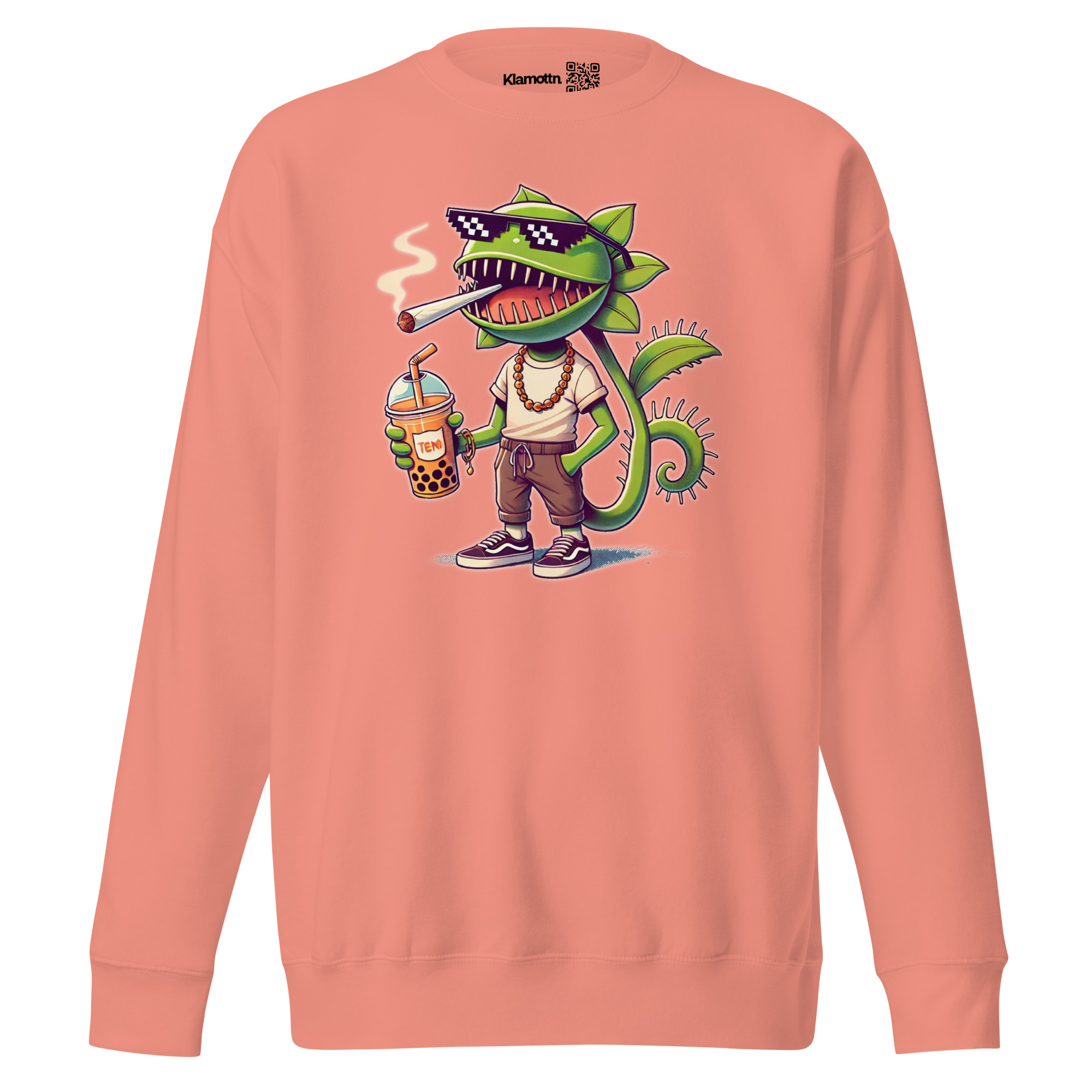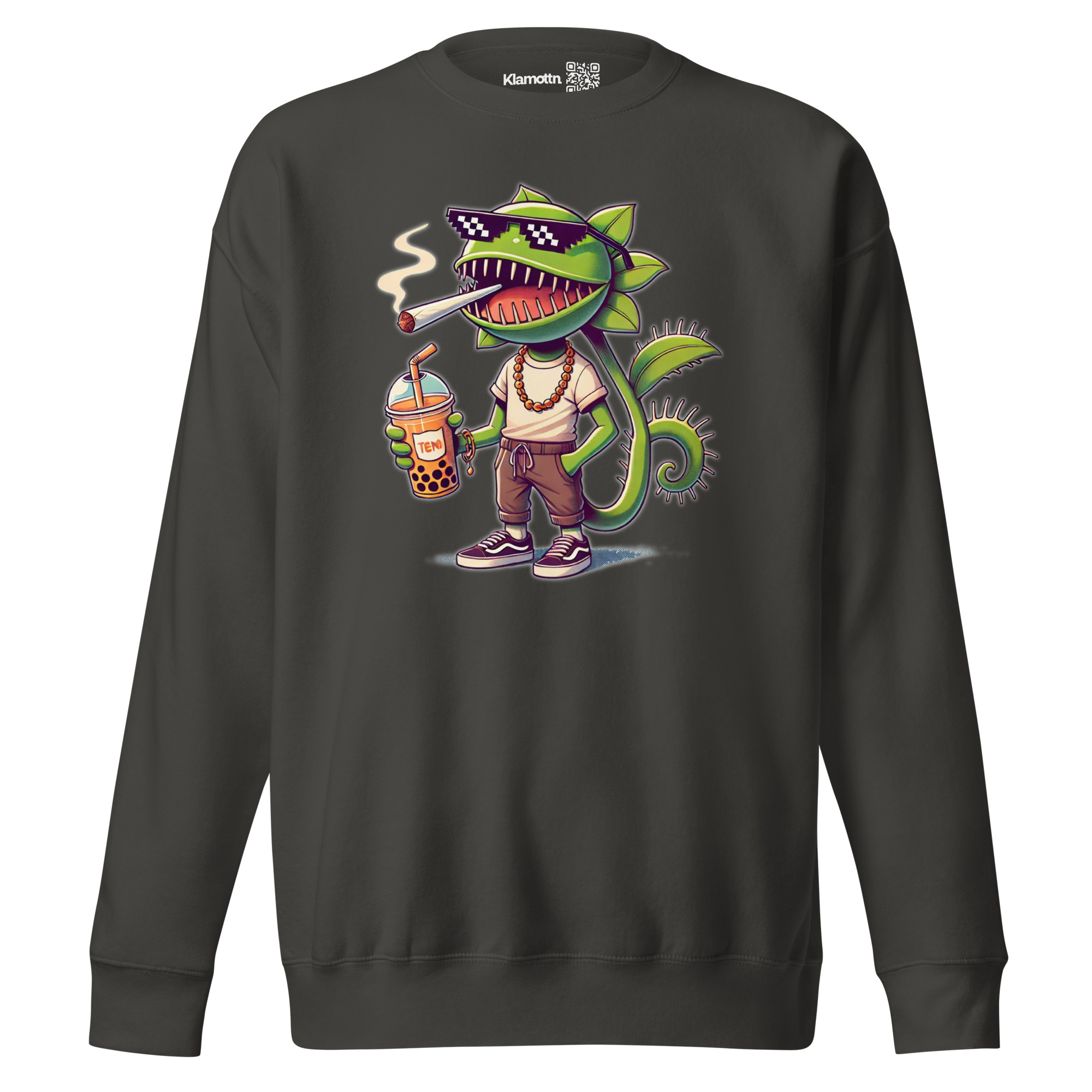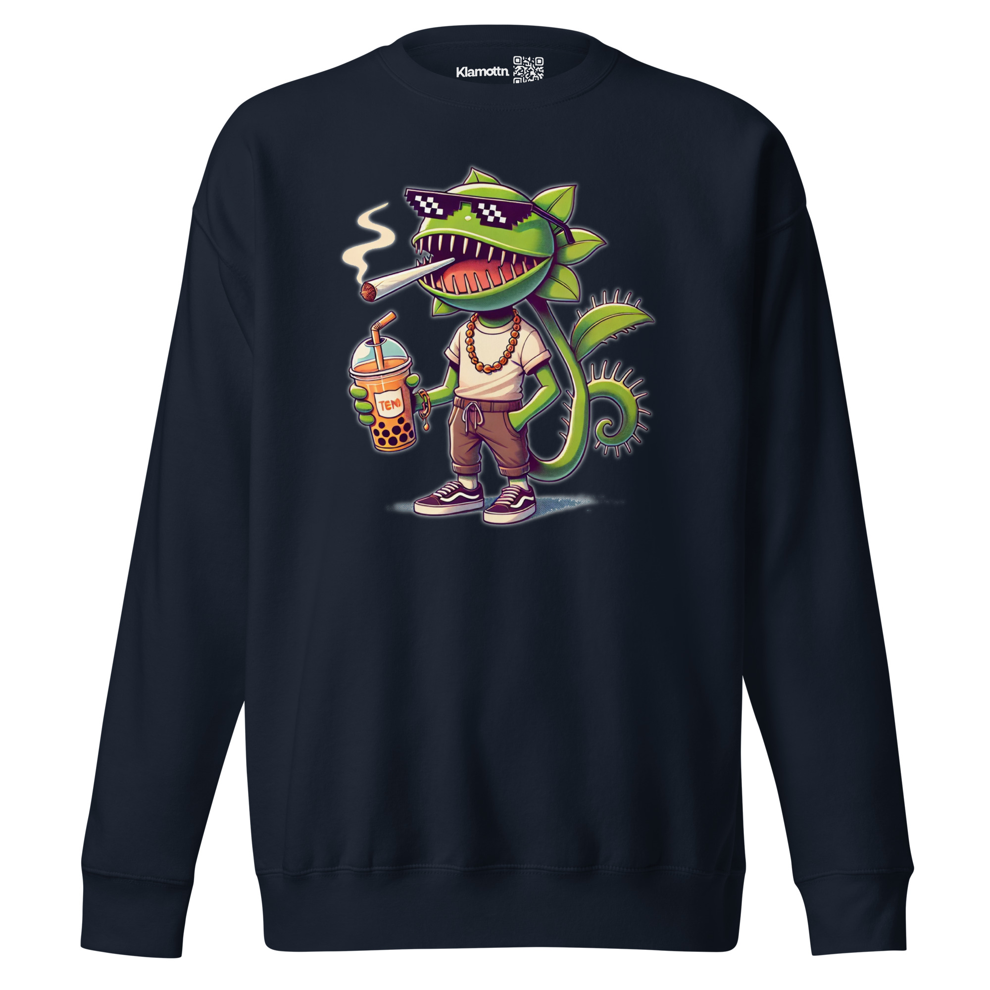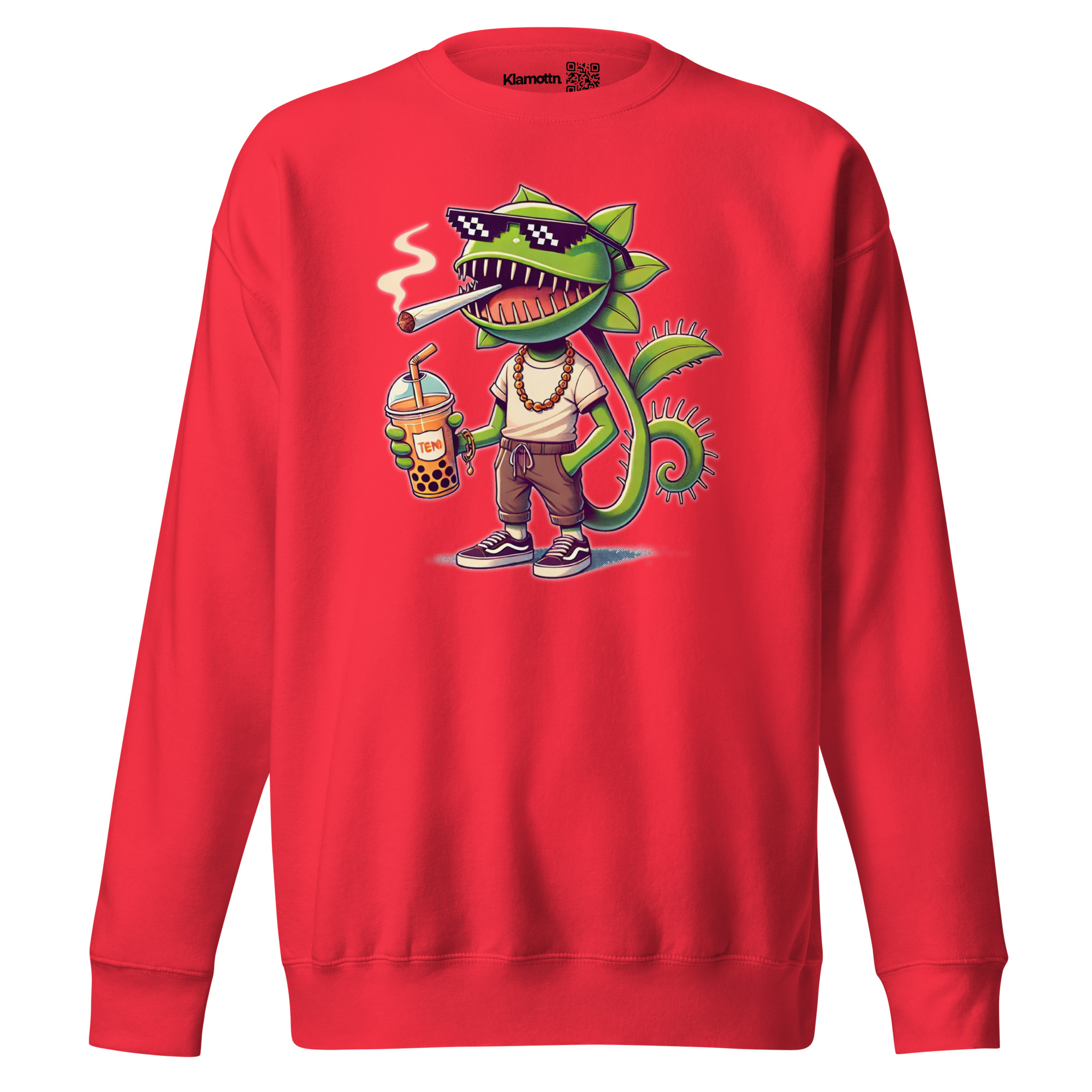 Dieses Design zeigt eine lässige, anthropomorphe Venusfliegenfalle, die in Sachen Coolness ganz vorne mitspielt. Mit verschmitztem Grinsen, stylischer Pixel-Sonnenbrille, einer lockeren Kette um den Hals und bequemen Streetwear-Klamotten strahlt sie pure Gelassenheit aus. Der Joint steckt entspannt im Mundwinkel, während sie in der einen Hand lässig einen Boba-Tea mit großen Bubbles/Perlen hält. Die andere Hand steckt tief in der Hosentasche – ein klares Zeichen für entspannte Attitüde. Die detailreiche Darstellung mit satten Grüntönen, kontrastreichen Schatten und frechem Ausdruck macht dieses Motiv zu einem echten Hingucker für alle, die Humor, Streetstyle und ein bisschen Rebellion lieben.
