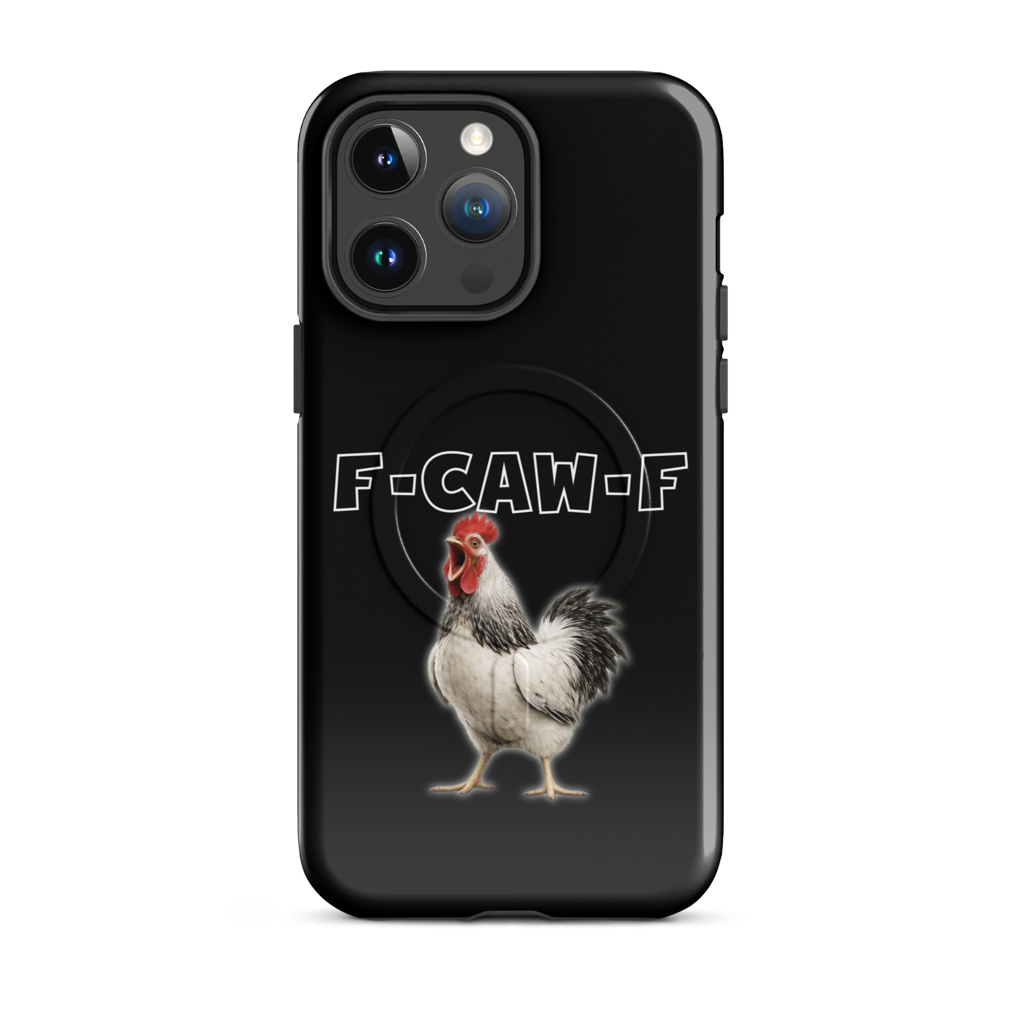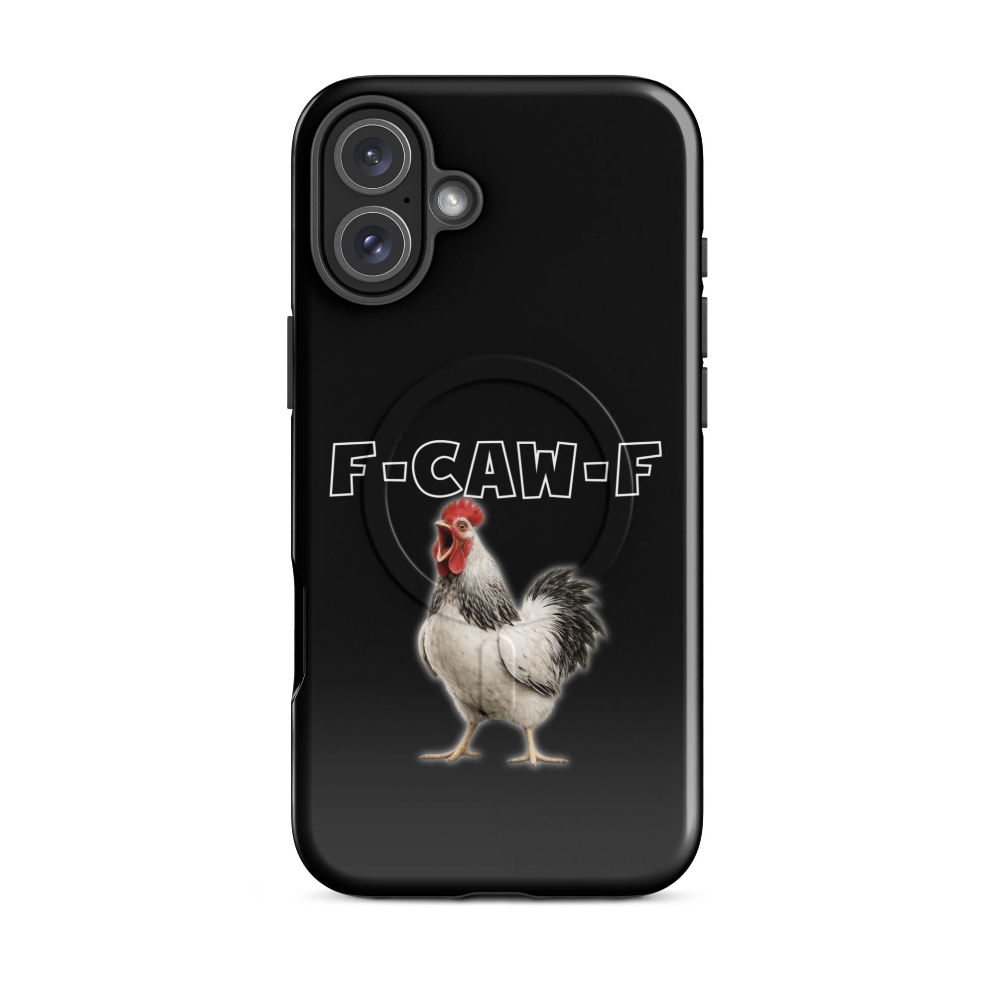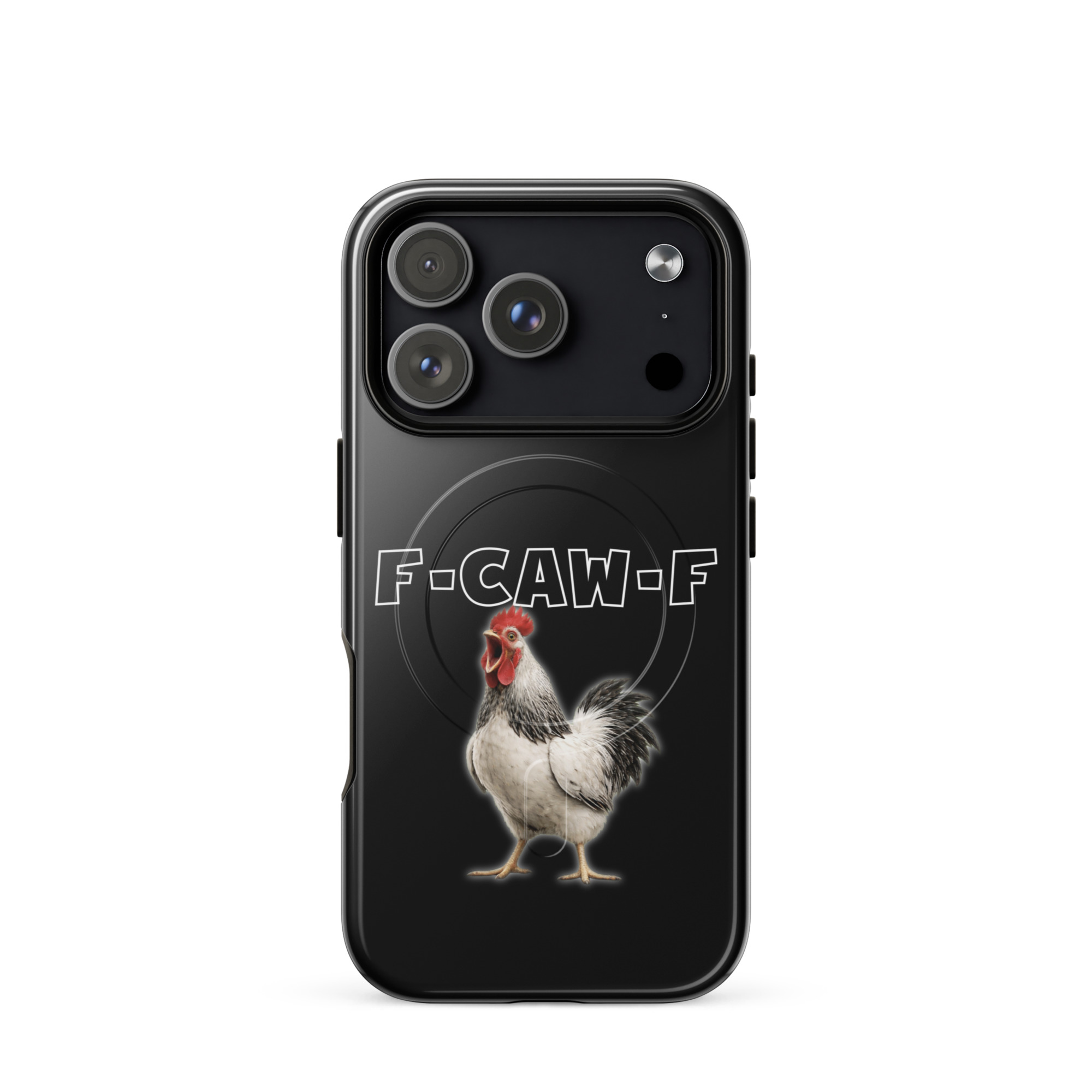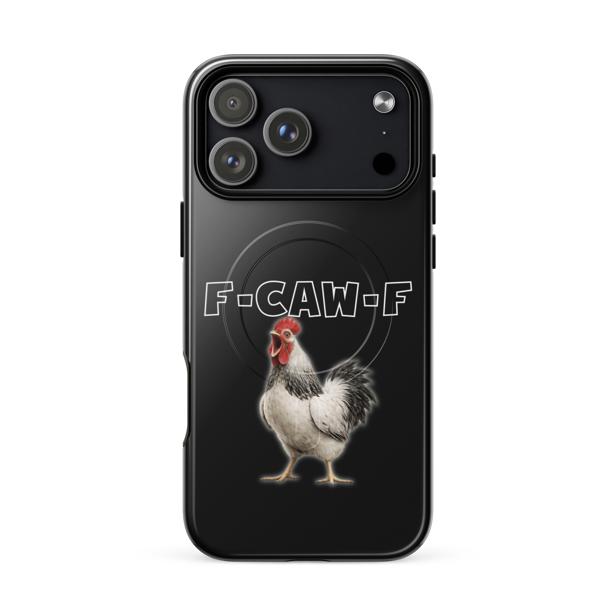 Das ist kein harmloses Gegacker, das ist ein akustischer Mittelfinger mit Federn. Das Motiv greift genau den Moment auf, in dem das Huhn mit weit geöffnetem Schnabel losschreit und dieses Gegacker plötzlich wie „F-Caw-F“ klingt.