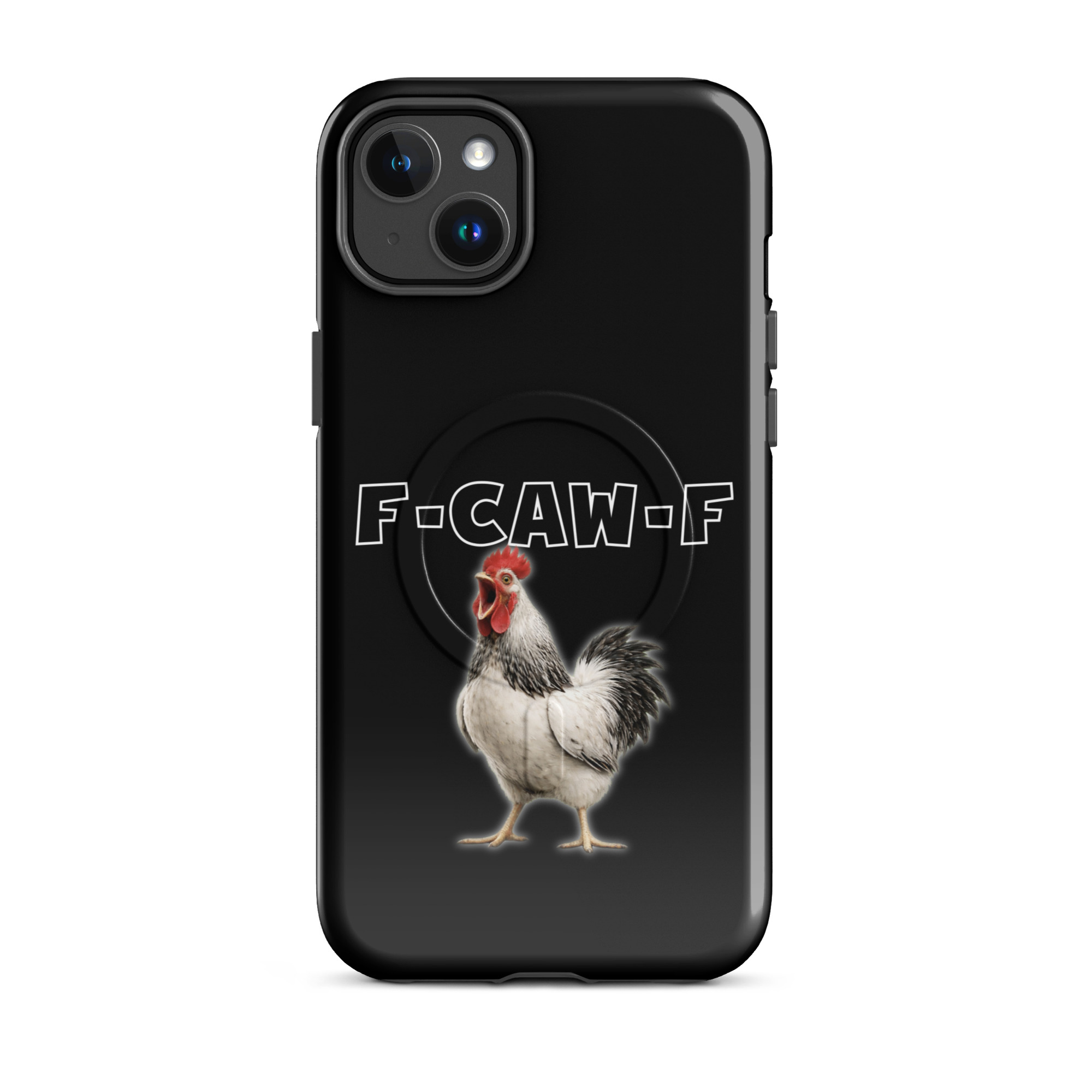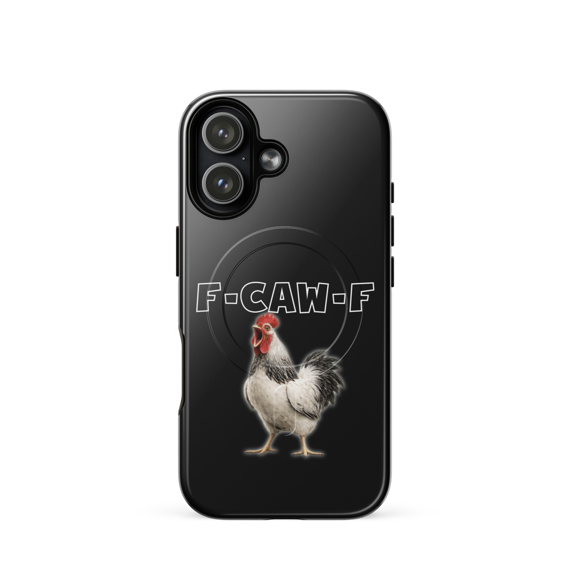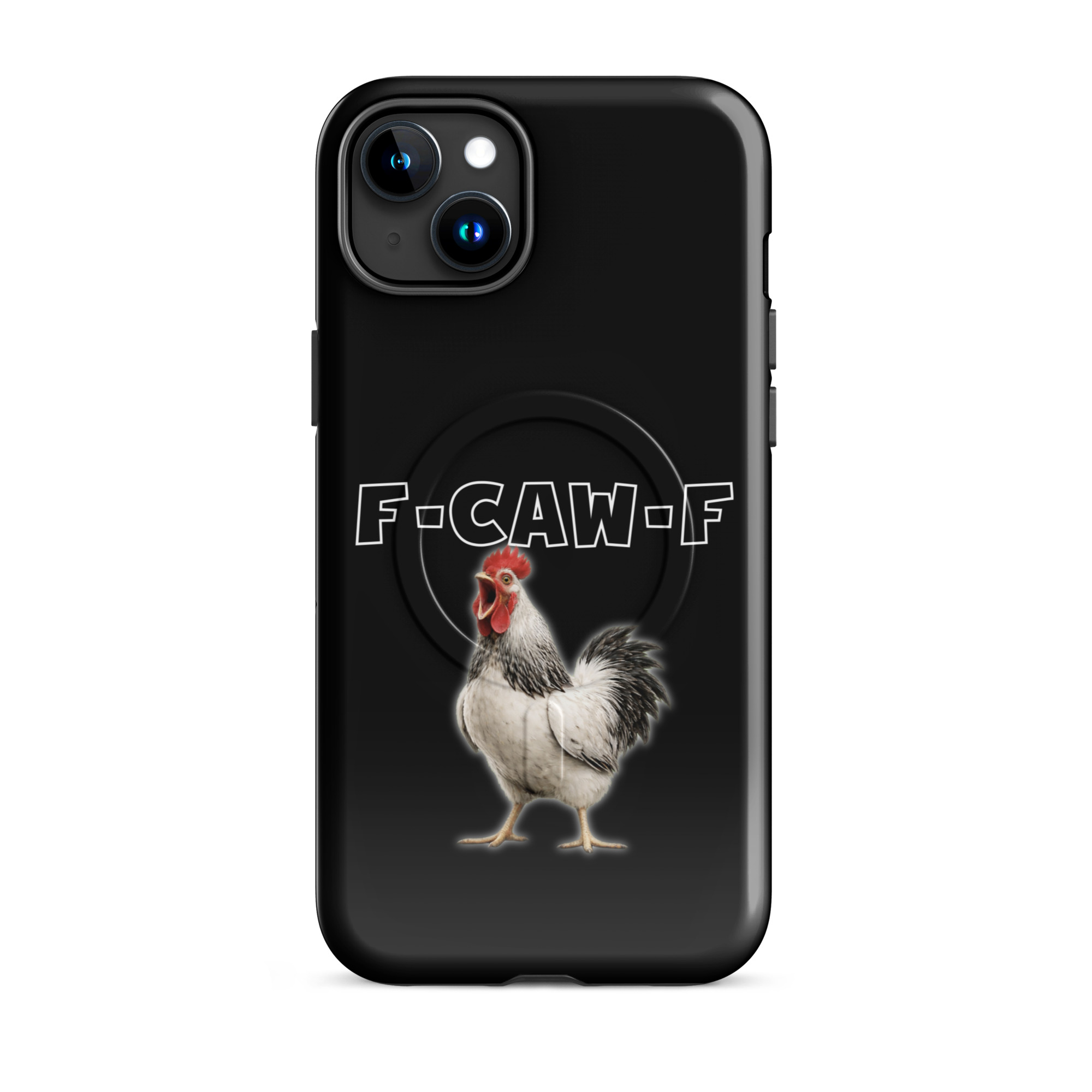 Das ist kein harmloses Gegacker, das ist ein akustischer Mittelfinger mit Federn. Das Motiv greift genau den Moment auf, in dem das Huhn mit weit geöffnetem Schnabel losschreit und dieses Gegacker plötzlich wie „F-Caw-F“ klingt.