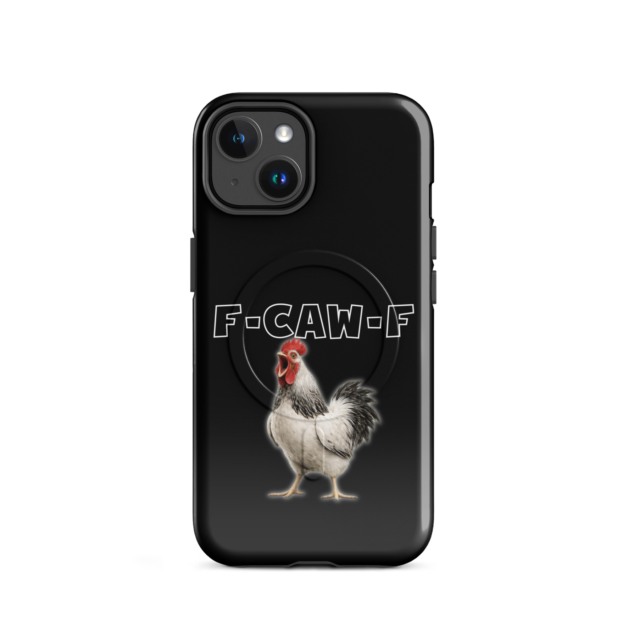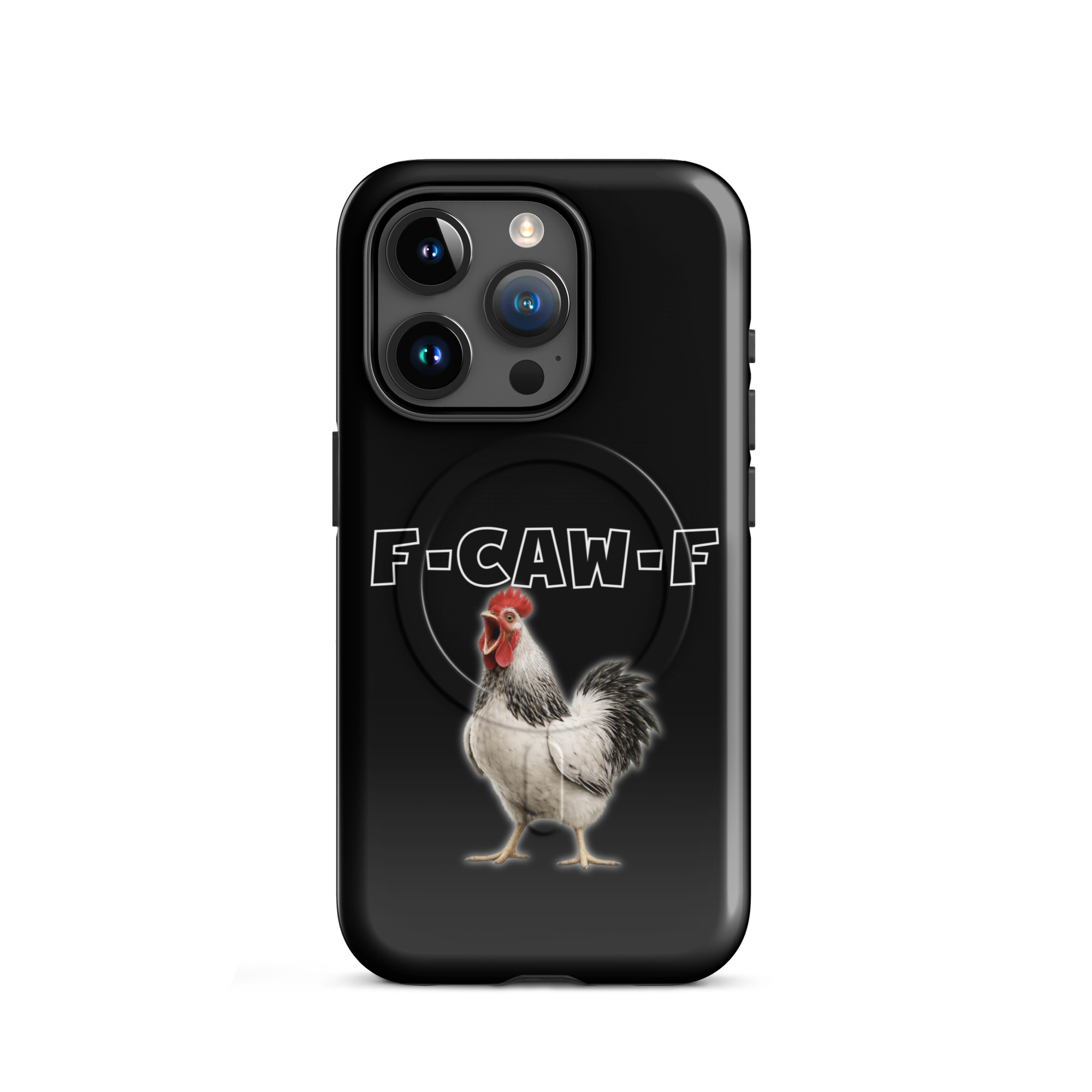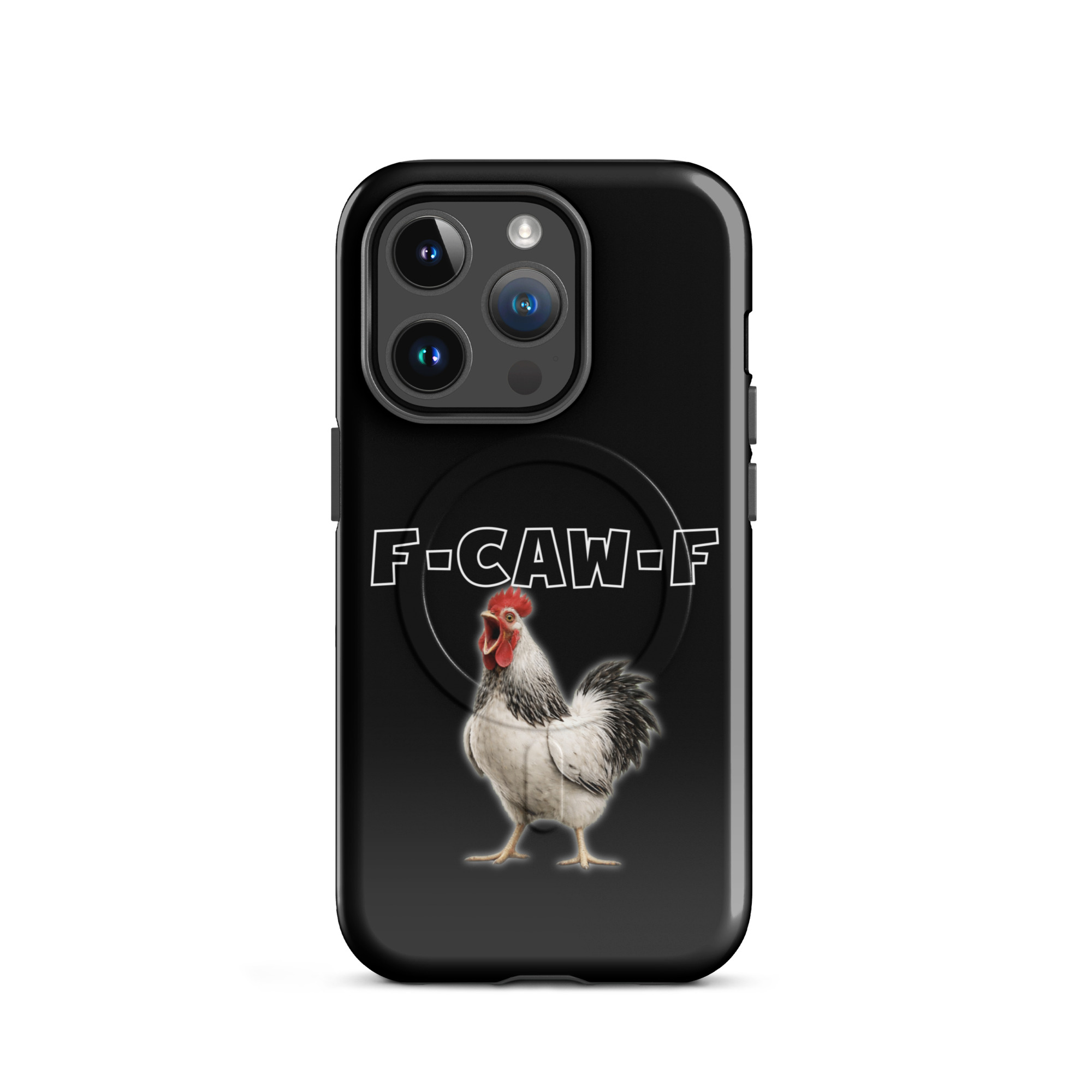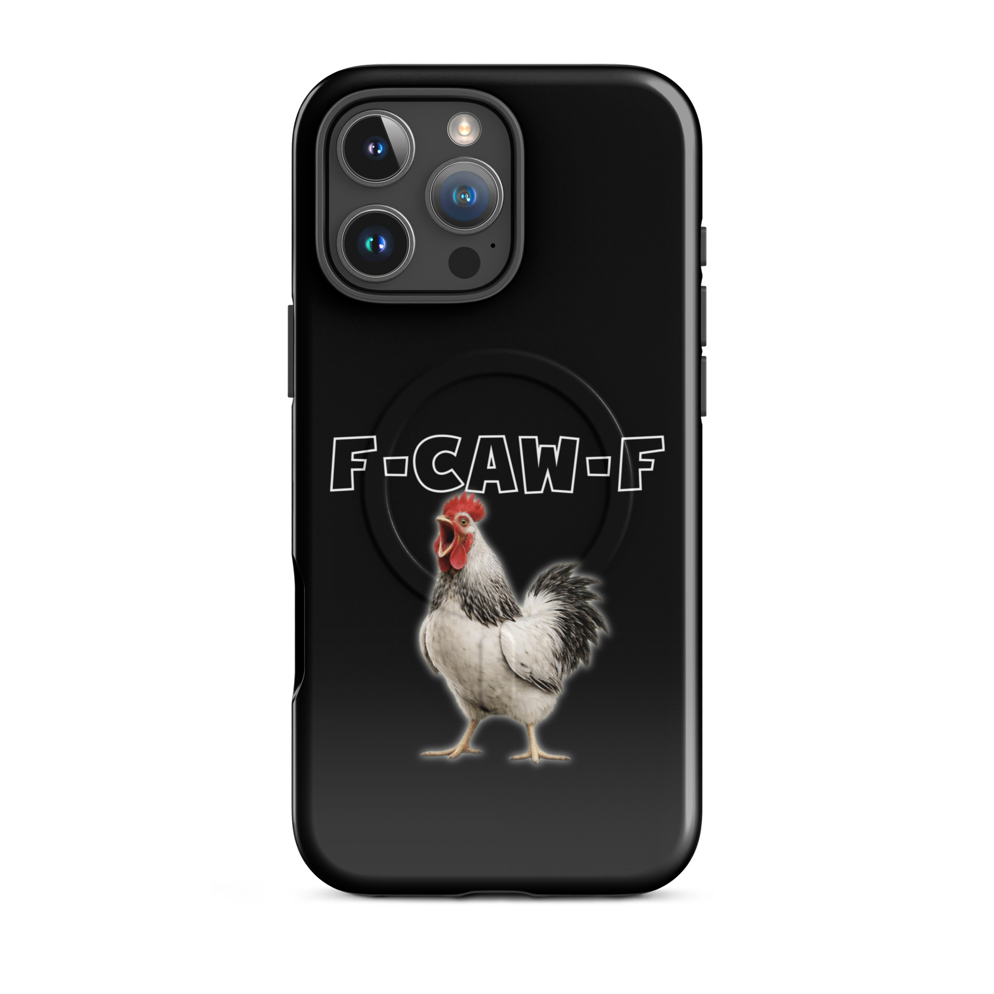 Das ist kein harmloses Gegacker, das ist ein akustischer Mittelfinger mit Federn. Das Motiv greift genau den Moment auf, in dem das Huhn mit weit geöffnetem Schnabel losschreit und dieses Gegacker plötzlich wie „F-Caw-F“ klingt.