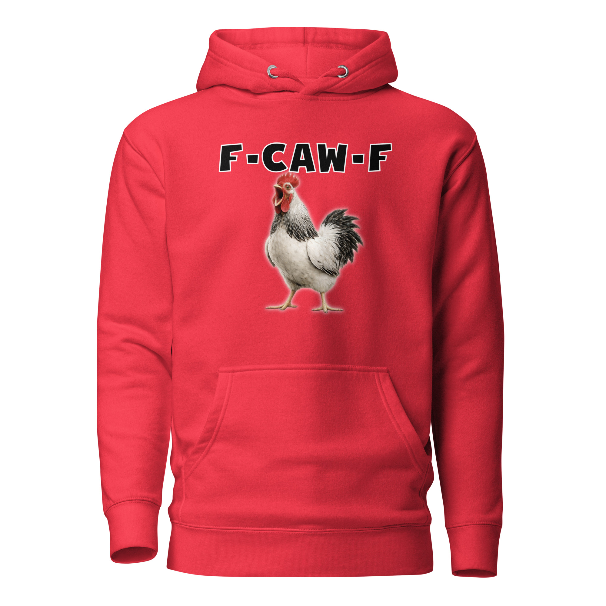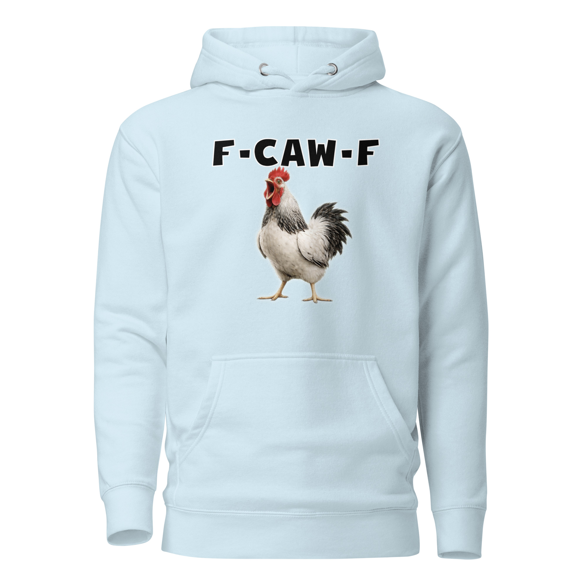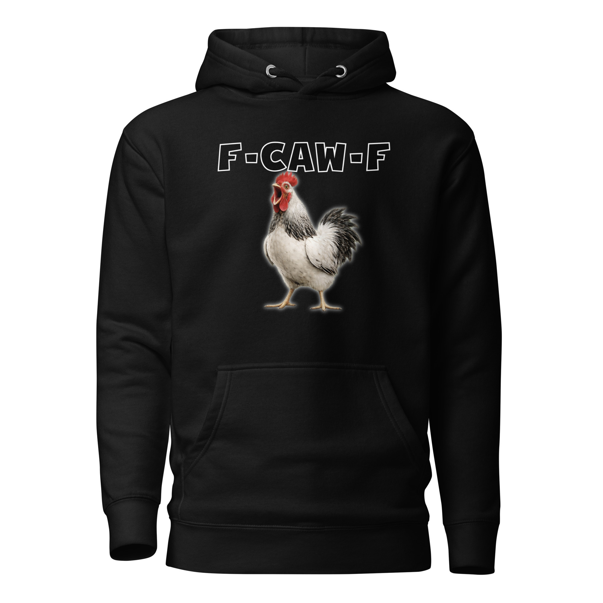 Das ist kein harmloses Gegacker, das ist ein akustischer Mittelfinger mit Federn. Das Motiv greift genau den Moment auf, in dem das Huhn mit weit geöffnetem Schnabel losschreit und dieses Gegacker plötzlich wie „F-Caw-F“ klingt.