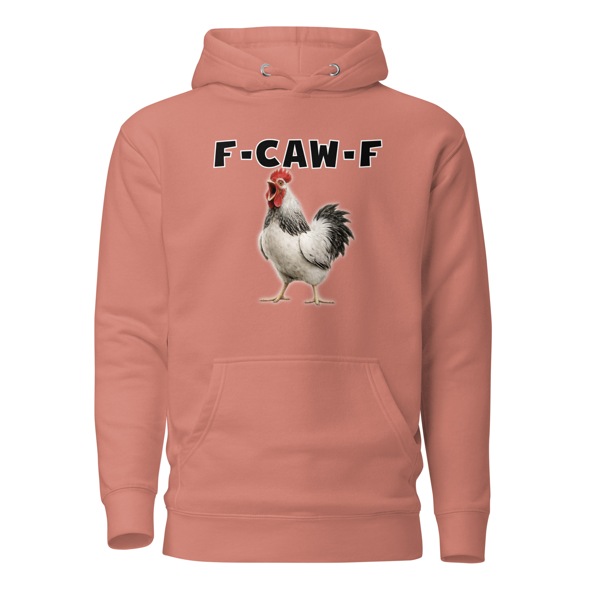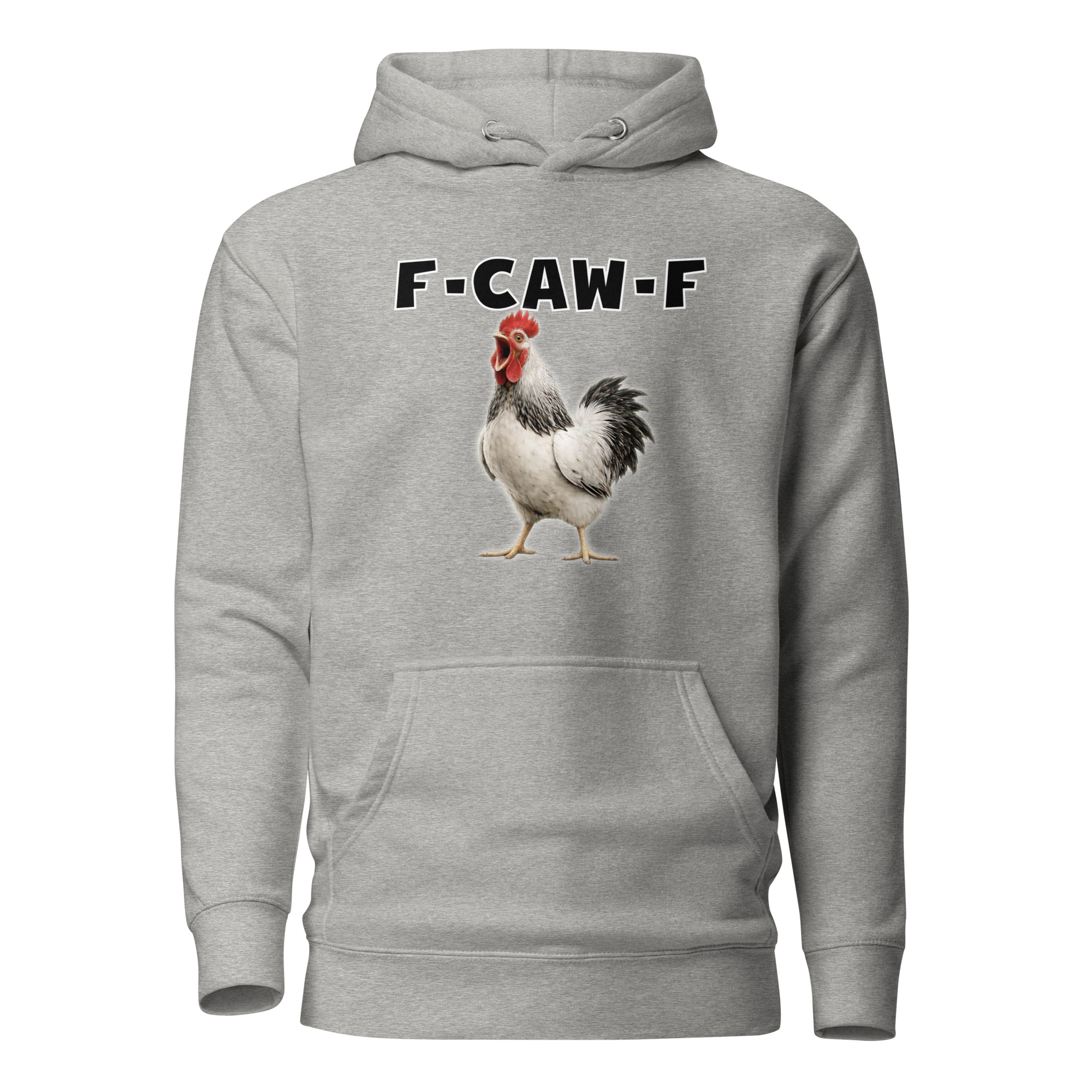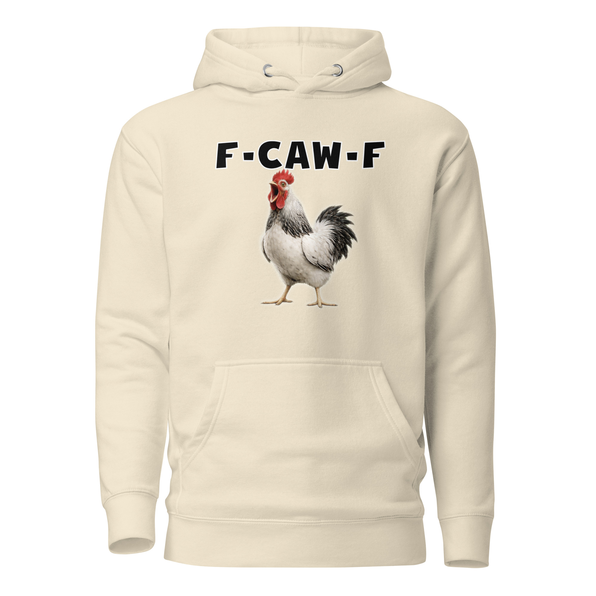 Das ist kein harmloses Gegacker, das ist ein akustischer Mittelfinger mit Federn. Das Motiv greift genau den Moment auf, in dem das Huhn mit weit geöffnetem Schnabel losschreit und dieses Gegacker plötzlich wie „F-Caw-F“ klingt.