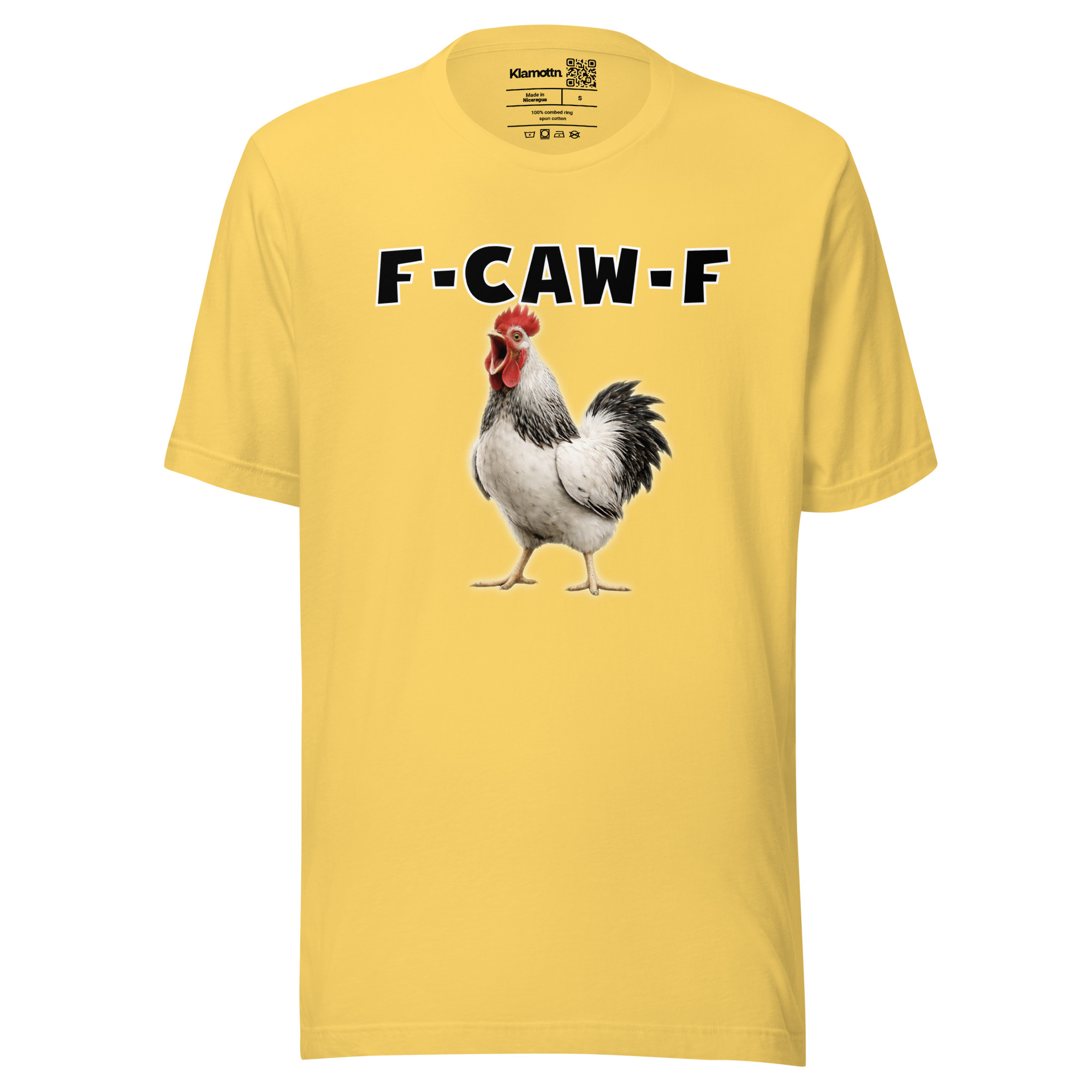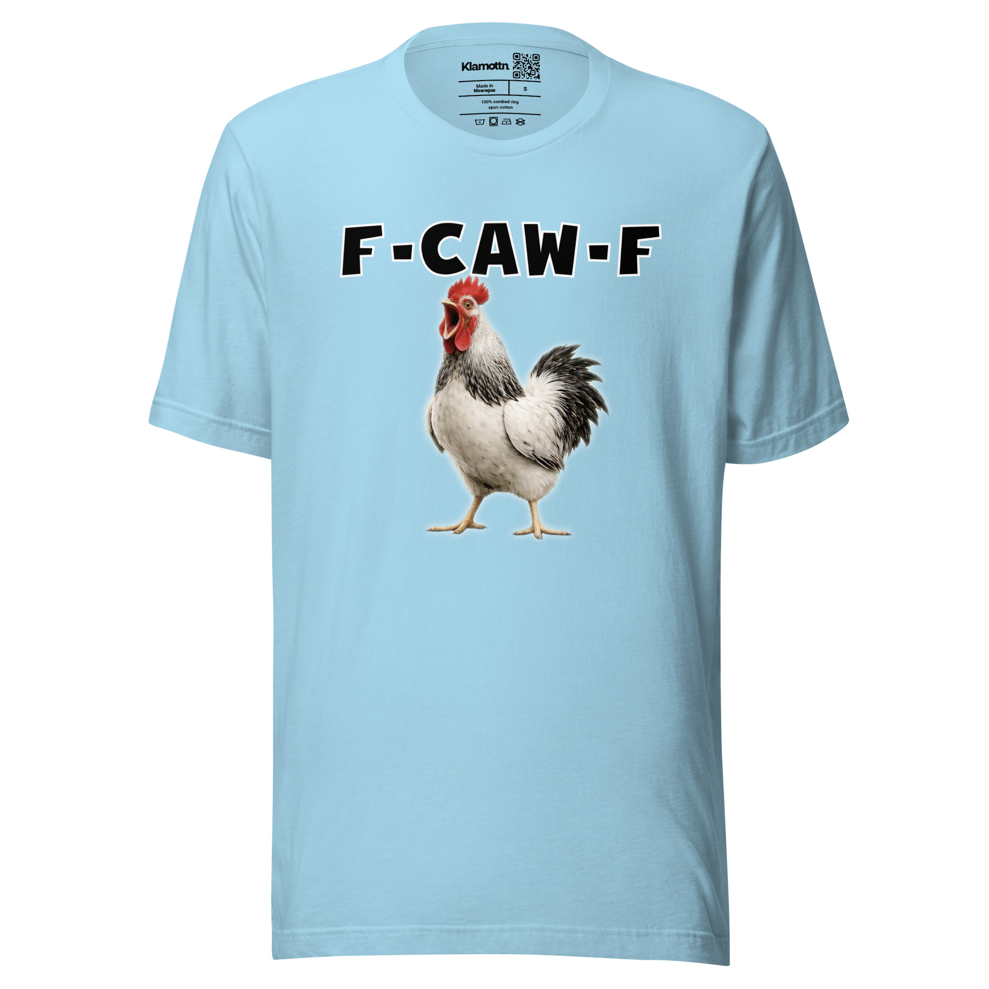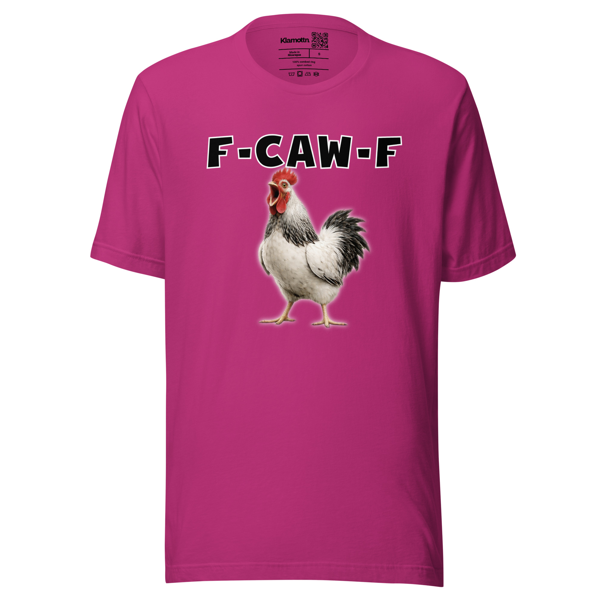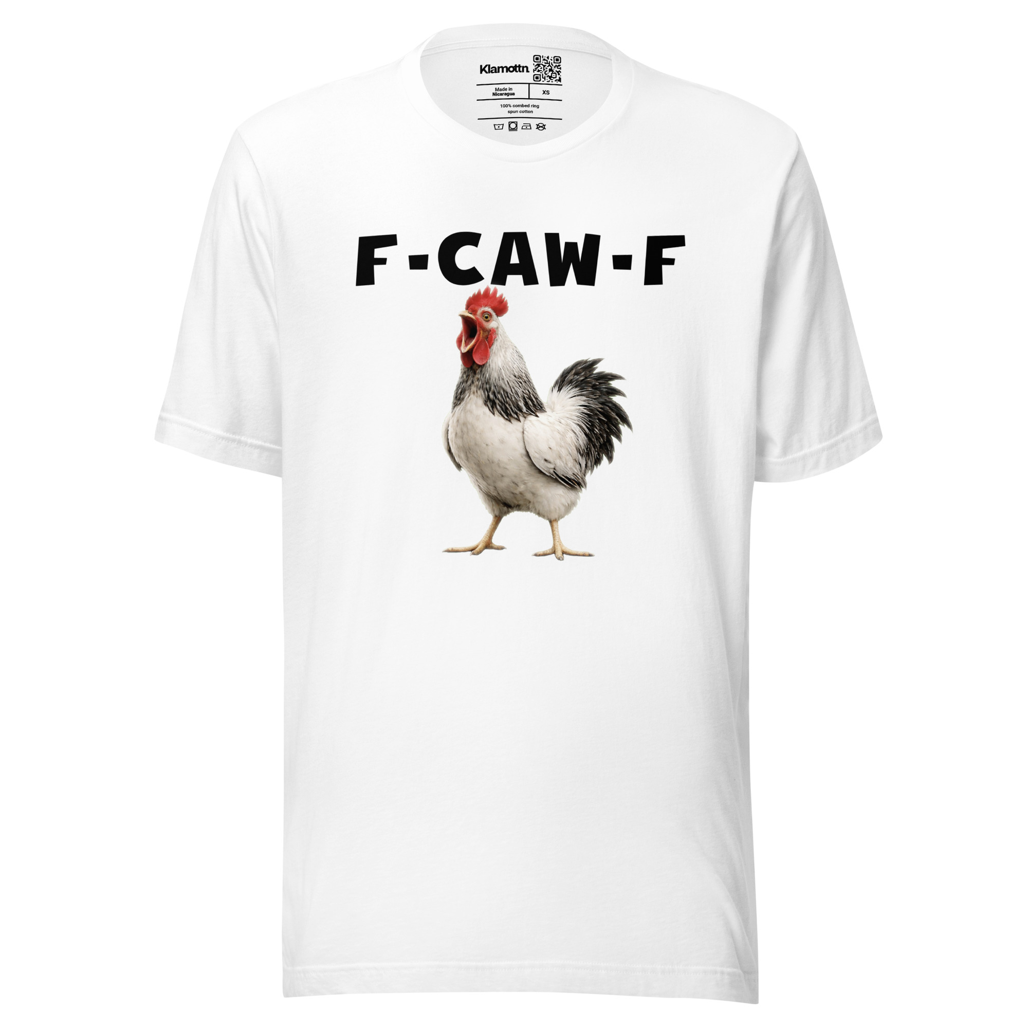 Das ist kein harmloses Gegacker, das ist ein akustischer Mittelfinger mit Federn. Das Motiv greift genau den Moment auf, in dem das Huhn mit weit geöffnetem Schnabel losschreit und dieses Gegacker plötzlich wie „F-Caw-F“ klingt.