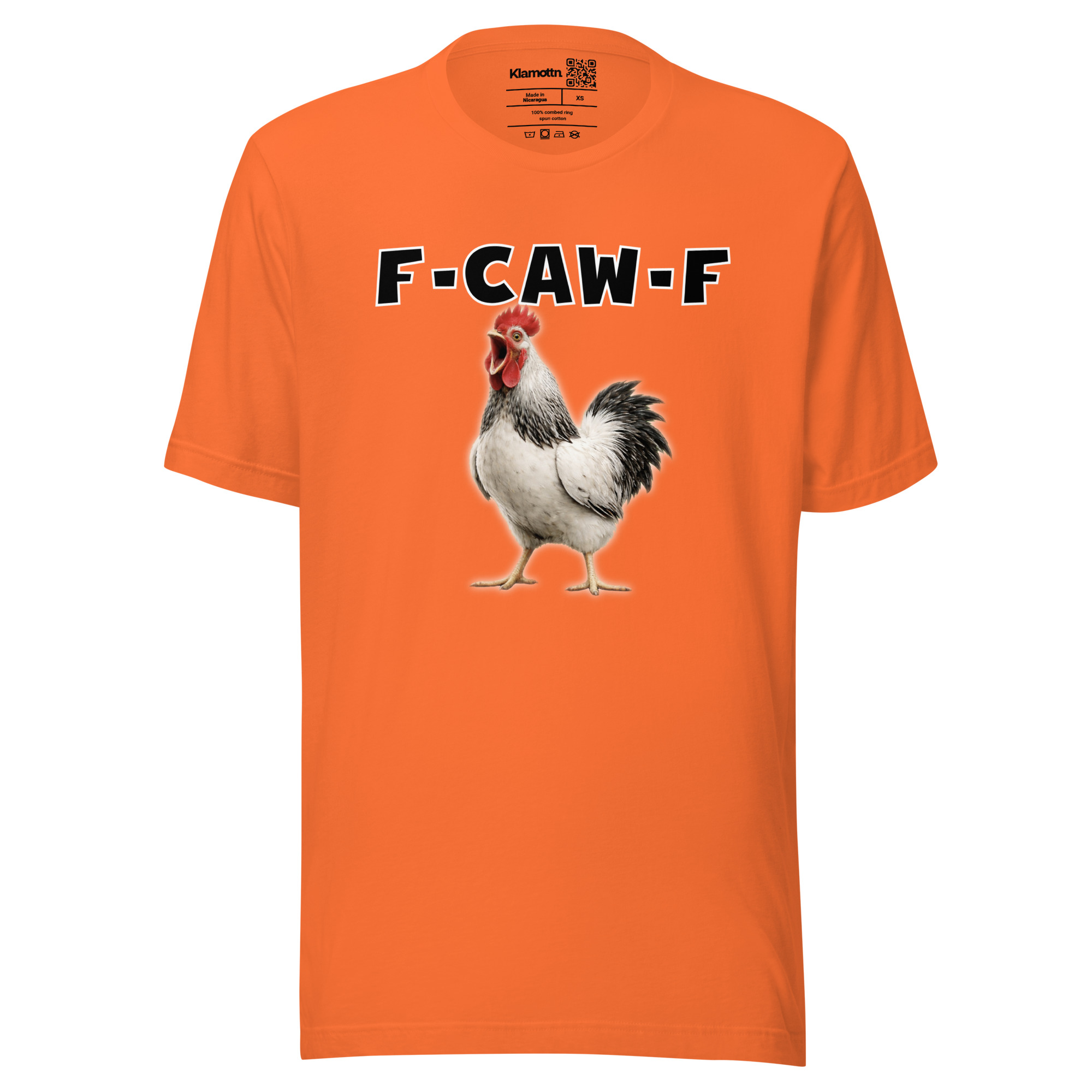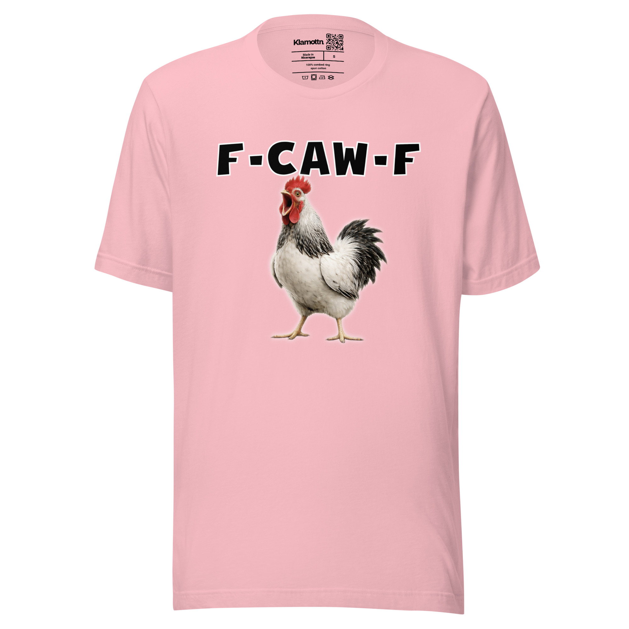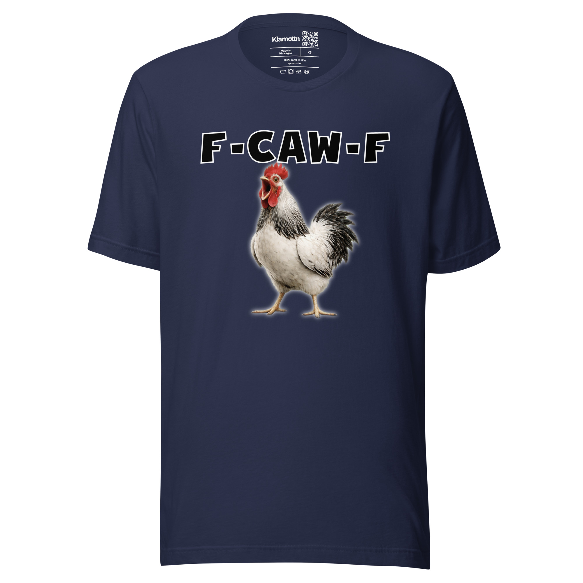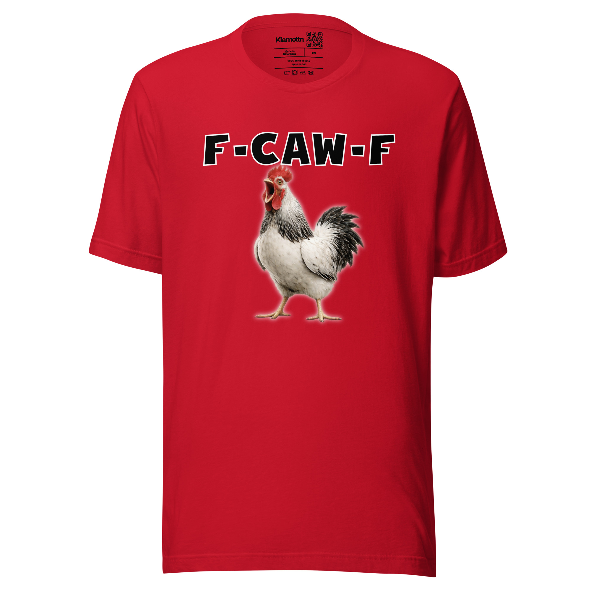 Das ist kein harmloses Gegacker, das ist ein akustischer Mittelfinger mit Federn. Das Motiv greift genau den Moment auf, in dem das Huhn mit weit geöffnetem Schnabel losschreit und dieses Gegacker plötzlich wie „F-Caw-F“ klingt.