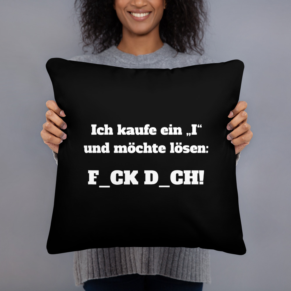 Dieses lustige Ich kaufe ein I und möchte lösen: F.ck D.ch Basic-Kissen ist für alle perfekt, welche einfach nur noch genervt sind. Von Idioten, einfach von allem. Egal ob dumme Fragen, dumme Menschen oder was auch sonst. Es passt für alles! Das lustige Ich kaufe ein „I“ und möchte lösen: F.ck D.ch Basic-Kissen bringt genau das zum Ausdruck. Wenn du einfach mal Fick Dich oder Fuck you sagen willst, lege es deinem nächsten Gast hin.