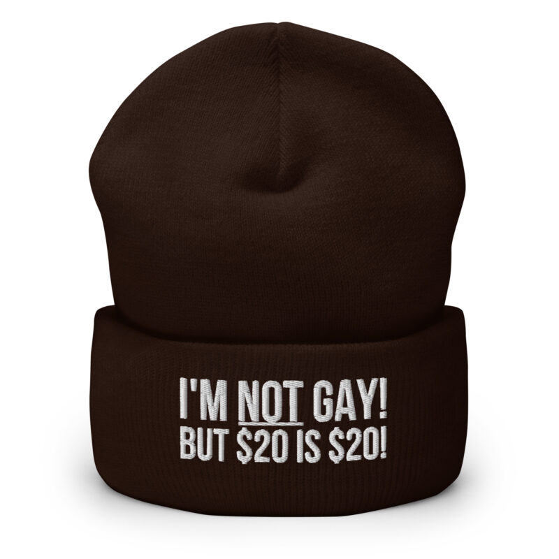 Hier kommt ein Design, das direkt ins Schwarze trifft! Mit „I’m not gay but $20 is $20“ kombinierst du schlagfertigen Humor mit einer gehörigen Portion Selbstironie. Der Satz ist provokant, sorgt aber garantiert für Lacher und bricht das Eis in jeder Runde. Egal, ob du auf witzige Statements stehst oder einfach mal die Grenzen des Humors ausloten willst – dieser Spruch ist ein echter Hingucker. Perfekt für alle, die nicht alles so ernst nehmen und dabei trotzdem ein Statement setzen wollen! Und schließlich sind $20 ja auch $20, nicht wahr?