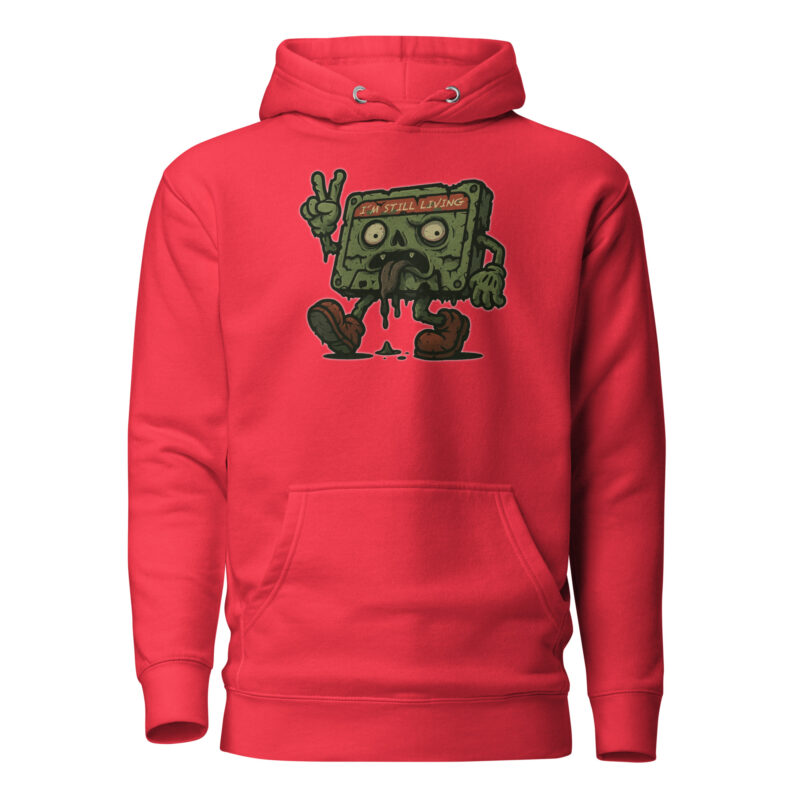 Diese abgefahrene Zombie-Kassette bringt Nostalgie, Humor und eine ordentliche Portion Grusel zusammen. Mit dem Schriftzug „I’M STILL LIVING“ auf dem Label setzt dieses Design ein klares Statement: Alt, verwest, aber noch lange nicht tot! Die Kassette hat einen verwesten Look mit hervorquellenden Augen, heraushängender Zunge und matschigen Details – perfekt ergänzt durch ein Peace-Zeichen und klobige, rote Schuhe. Der Comicstil verleiht dem Ganzen eine verspielte, punkige Note. Ideal für alle, die auf Retro-Vibes, Horror-Ästhetik und ironischen Humor stehen. Ein Must-have für Fans von Oldschool-Medien und skurrilen Designs mit Charakter!