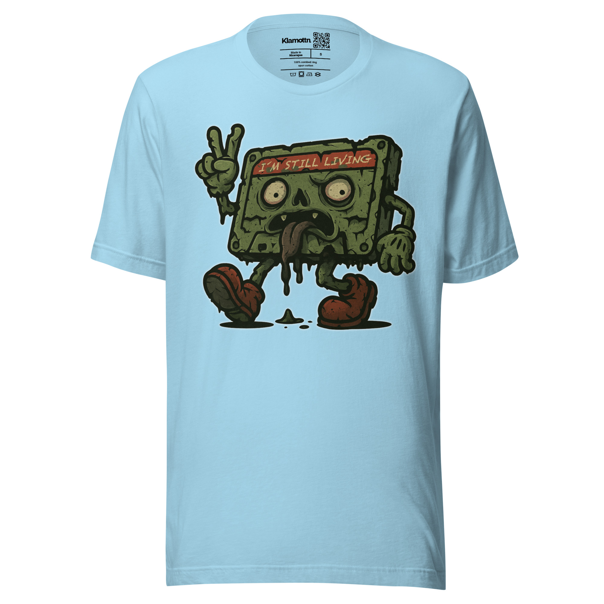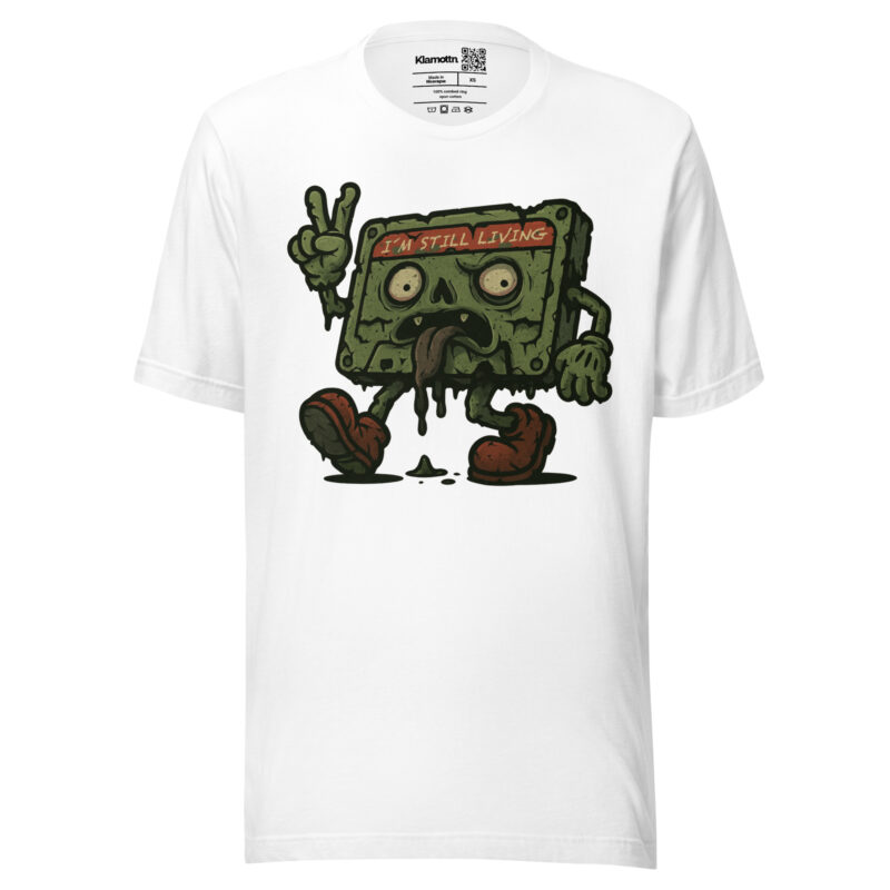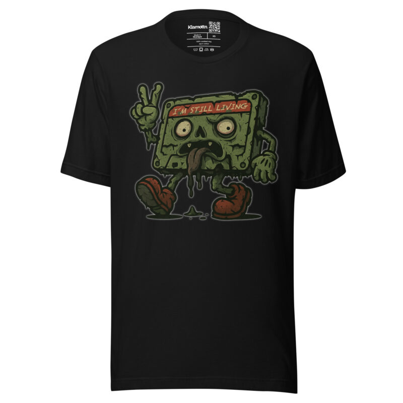 Diese abgefahrene Zombie-Kassette bringt Nostalgie, Humor und eine ordentliche Portion Grusel zusammen. Mit dem Schriftzug „I’M STILL LIVING“ auf dem Label setzt dieses Design ein klares Statement: Alt, verwest, aber noch lange nicht tot! Die Kassette hat einen verwesten Look mit hervorquellenden Augen, heraushängender Zunge und matschigen Details – perfekt ergänzt durch ein Peace-Zeichen und klobige, rote Schuhe. Der Comicstil verleiht dem Ganzen eine verspielte, punkige Note. Ideal für alle, die auf Retro-Vibes, Horror-Ästhetik und ironischen Humor stehen. Ein Must-have für Fans von Oldschool-Medien und skurrilen Designs mit Charakter!