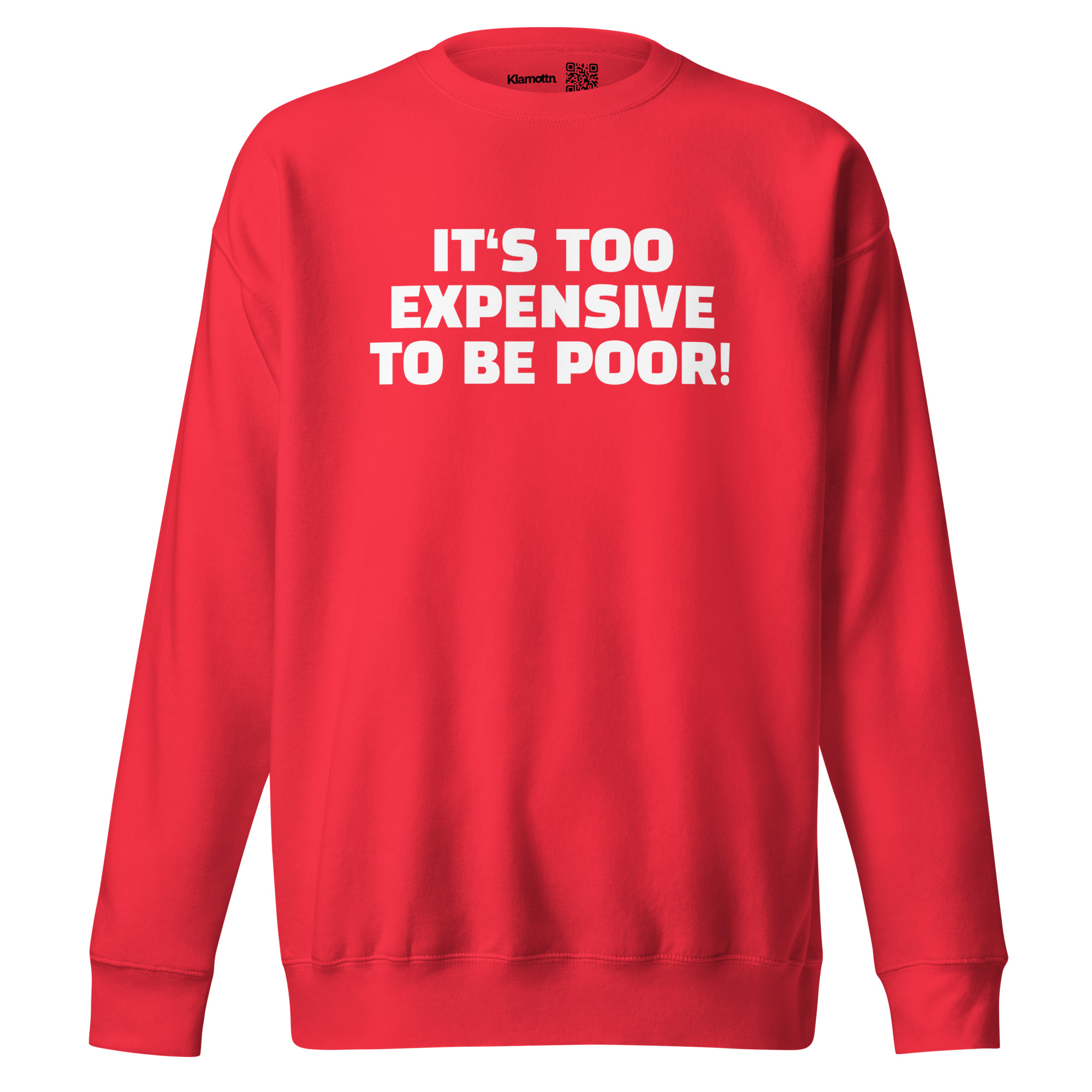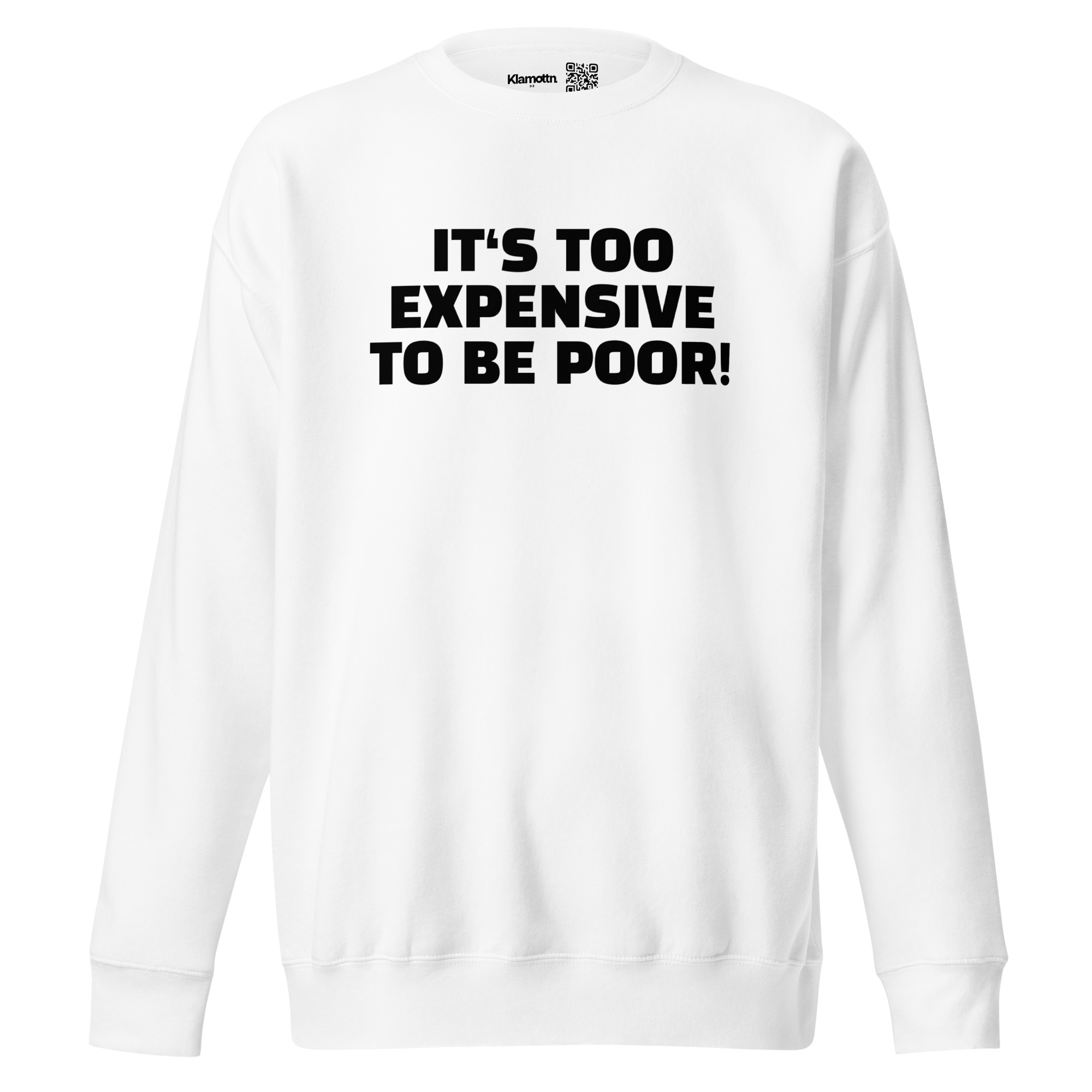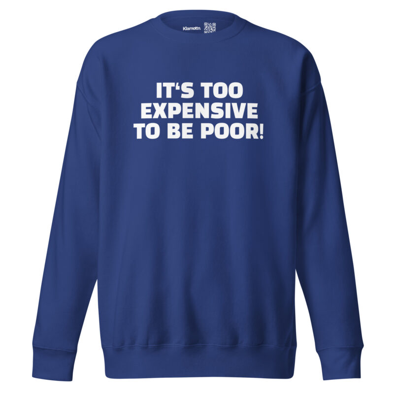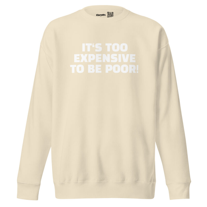 „It’s Too Expensive to Be Poor“ – oder auf Deutsch: „Es ist zu teuer, arm zu sein.“ Dieses Design bringt eine bittere Wahrheit auf den Punkt und verbindet Gesellschaftskritik mit einem Hauch Sarkasmus. Arm zu sein bedeutet oft, nicht die Mittel zu haben, langfristig zu sparen – billige Produkte halten nicht lange, höhere Kreditzinsen treffen die Schwächsten, und teurere Notlösungen werden zum Alltag. Wenn du es leid bist, diese Ironie stillschweigend zu akzeptieren, und ein Statement setzen willst, das zugleich clever und provokant ist, dann ist dieses Design perfekt für dich. Hol dir „It’s Too Expensive to Be Poor“ und mach auf die absurden Ungleichheiten unserer Welt aufmerksam – mit Humor und Stil.