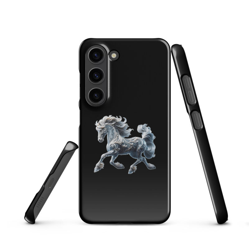 Dieses atemberaubende Design zeigt ein majestätisches Pferd, das wie aus einer Welle aus Wind und Wasser geformt zu sein scheint. Die geschwungenen, fast barock anmutenden Strukturen verleihen dem Motiv eine dramatische Eleganz – als ob das Tier selbst aus Sturm, Eis und Bewegung geboren wurde. Die Details erinnern an fein geschnittene Ornamente, mit einem Hauch von Glanz, der wie Tau oder Edelstein wirkt. Das Design strahlt Stärke, Freiheit und Anmut aus – perfekt für alle, die sich mit der wilden Kraft und mystischen Schönheit des Pferdes verbunden fühlen. Es vereint Fantasy-Ästhetik mit einem Hauch futuristischer Kunst und zieht garantiert alle Blicke auf sich. Wenn du starke visuelle Statements liebst und dich mit der Energie von Naturgewalten verbunden fühlst, ist dieses Design wie für dich gemacht.
