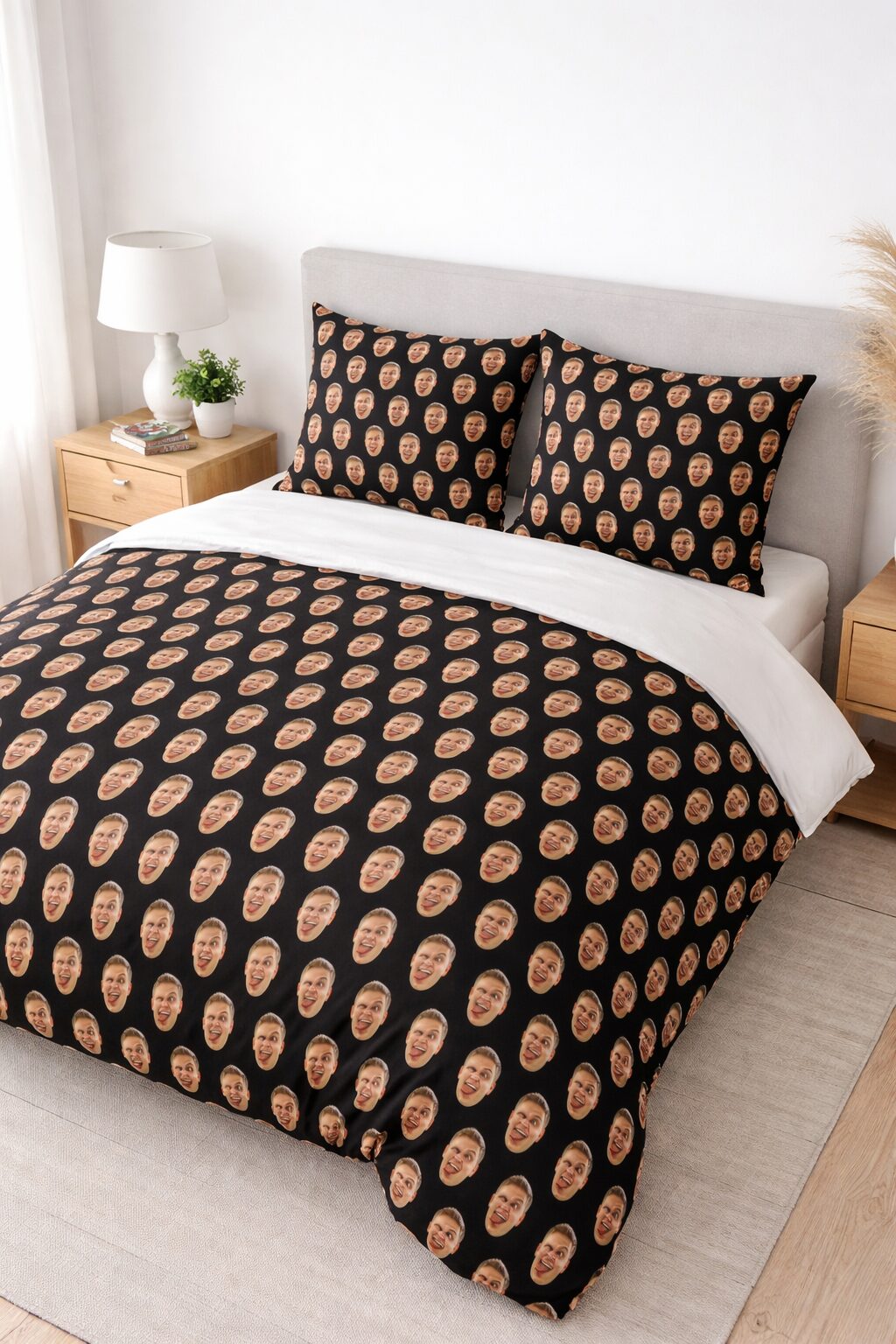 Mehr Persönlichkeit für dein Schlafzimmer: Diese personalisierbare Bettwäsche bestehend aus Bettbezug und passendem Kissenbezug verbindet Design, Emotion und Komfort zu einem stimmigen Gesamtbild. Mit deinem eigenen Foto oder Motiv wird aus schlichter Bettwäsche ein individuelles Wohnstatement – modern, persönlich und einzigartig.