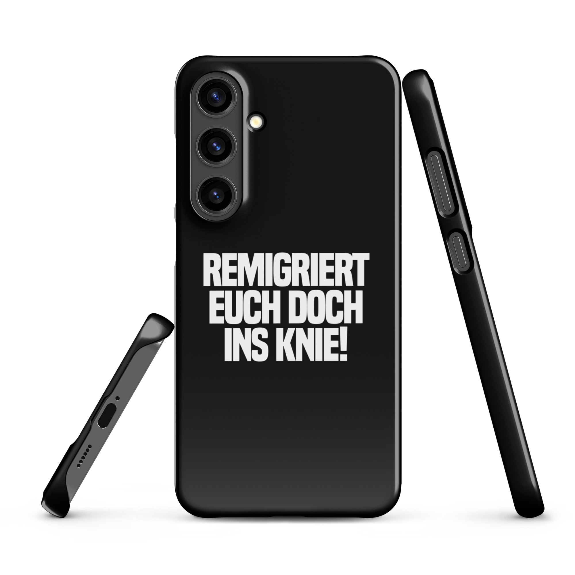 Dieses Design zeigt den provokativen Spruch „Remigriert euch doch ins Knie!“, der eine deutliche Absage an die Idee der Remigration, den Rechtsextremismus, die AfD sowie jede andere rechtsextreme Partei oder Gesinnung darstellt. Die Botschaft ist bewusst direkt und konfrontativ gewählt, um die Ablehnung dieser Konzepte und Strömungen klar zu kommunizieren. Der Spruch setzt ein Zeichen für die Entschlossenheit, sich gegen jegliche Form von rechtsextremer Politik und insbesondere gegen die Forderungen nach einer Remigration, also einer Abschiebung und Deportation, zu wehren. Er repräsentiert den Widerstand einer Gesellschaft, die sich für Vielfalt, Toleranz und ein solidarisches Miteinander einsetzt. Durch seine schlichte Darstellung wird die Aufmerksamkeit auf die starke Botschaft gelenkt: Ein klares Bekenntnis gegen rechtsextreme Ideologien und für ein Deutschland, das seine Vielfalt und Offenheit bewahrt und schützt.