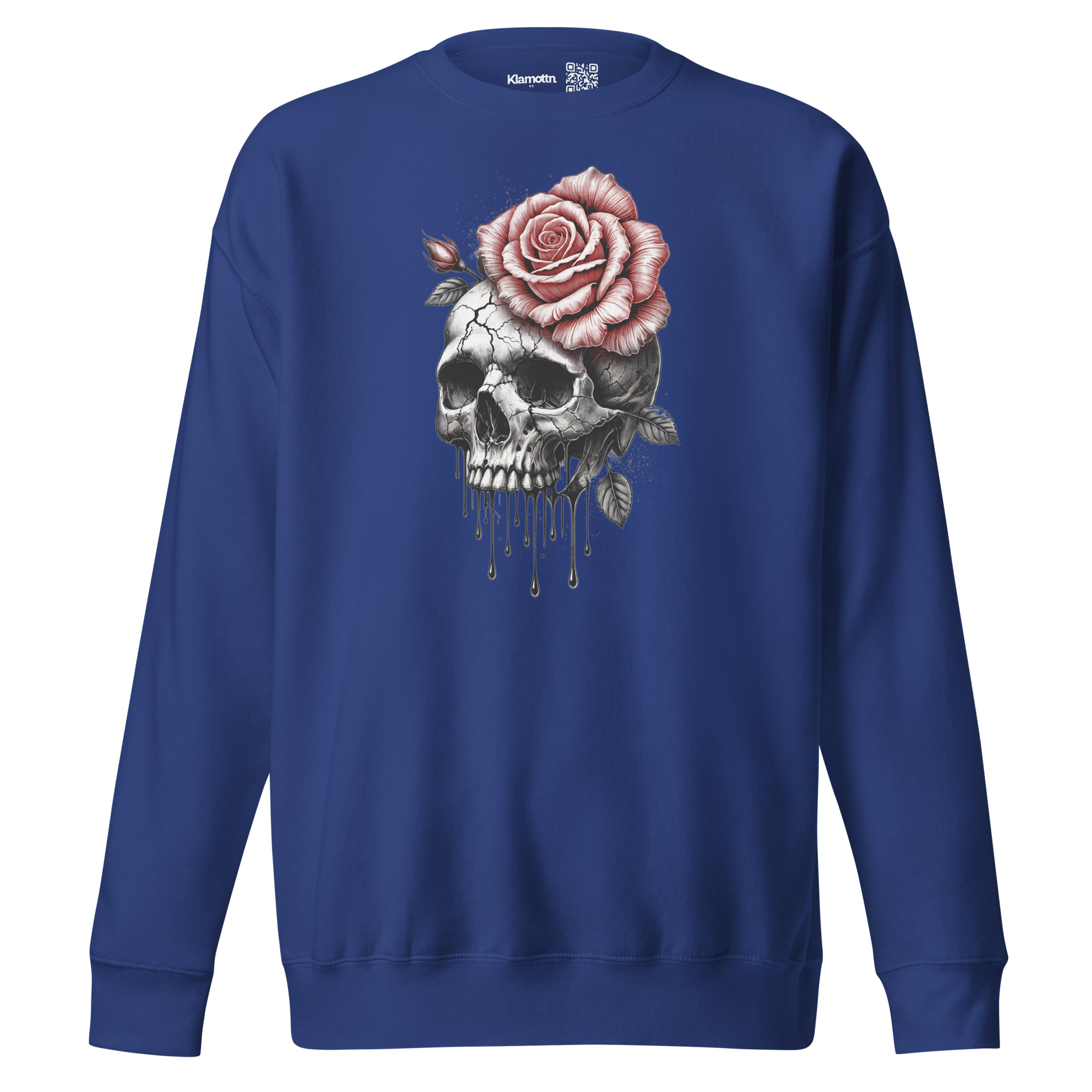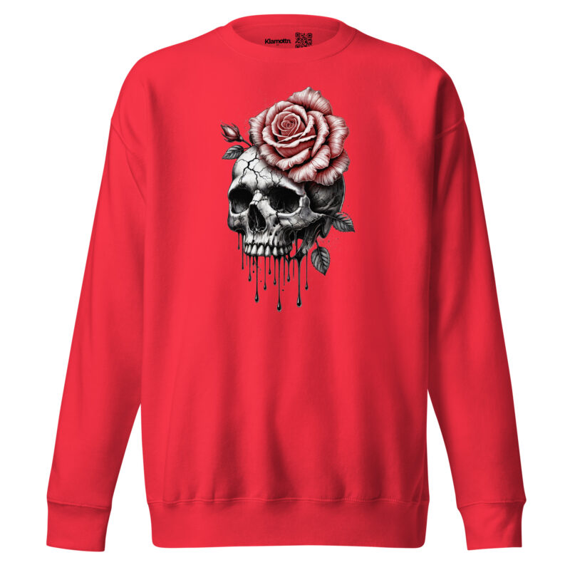 Dieses eindrucksvolle Design zeigt die kraftvolle Kombination aus einem detailliert gezeichneten Schädel und einer leuchtend roten Rose, die als Symbol für Leben und Vergänglichkeit steht. Die feinen Risse im Schädel, die dramatisch herabfließenden Tropfen und die zarte Rose mit ihren Blättern kreieren zusammen eine Szene voller Tiefe und Bedeutung. Dieses Motiv vereint auf kunstvolle Weise die Schönheit des Lebens mit der Unausweichlichkeit des Todes und ist perfekt für alle, die eine düstere, aber dennoch poetische Ästhetik schätzen. Hol dir dieses Design und zeige deine Faszination für die geheimnisvolle Verbindung von Leben und Tod – ein echter Hingucker für tiefgründige Seelen!