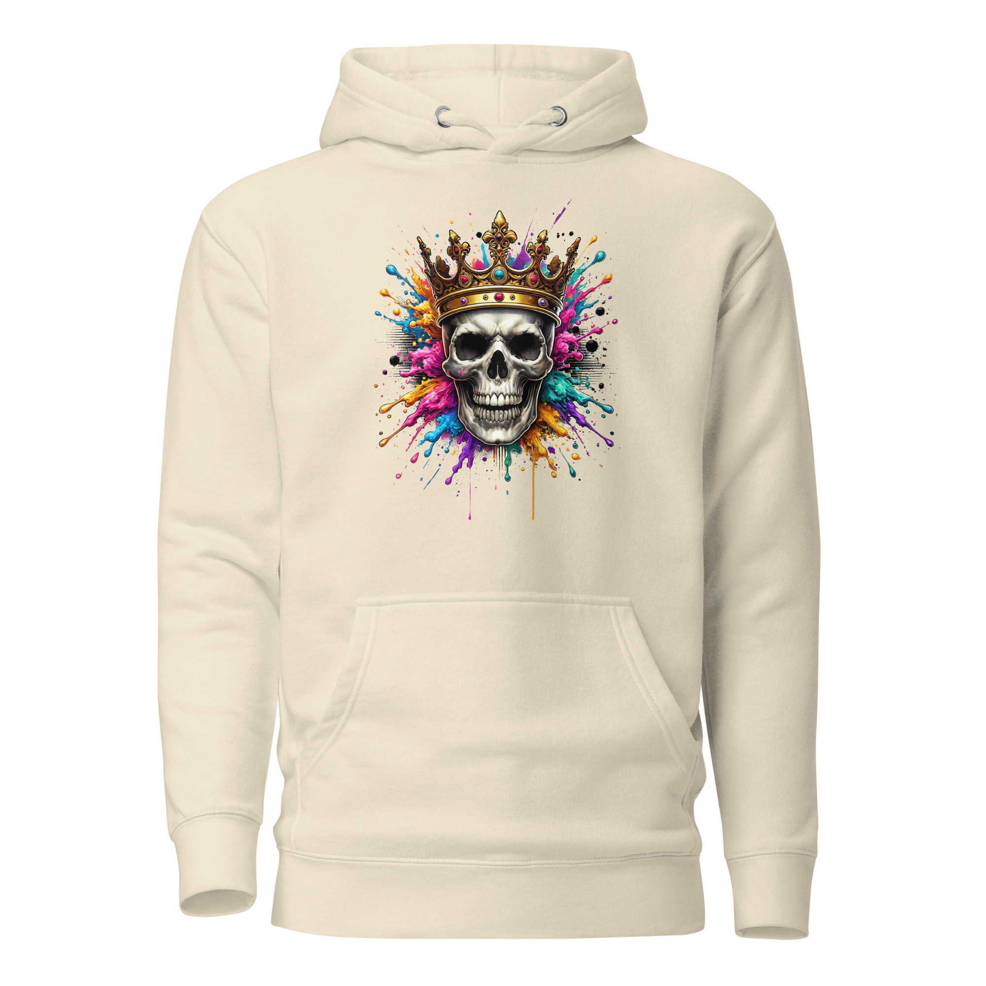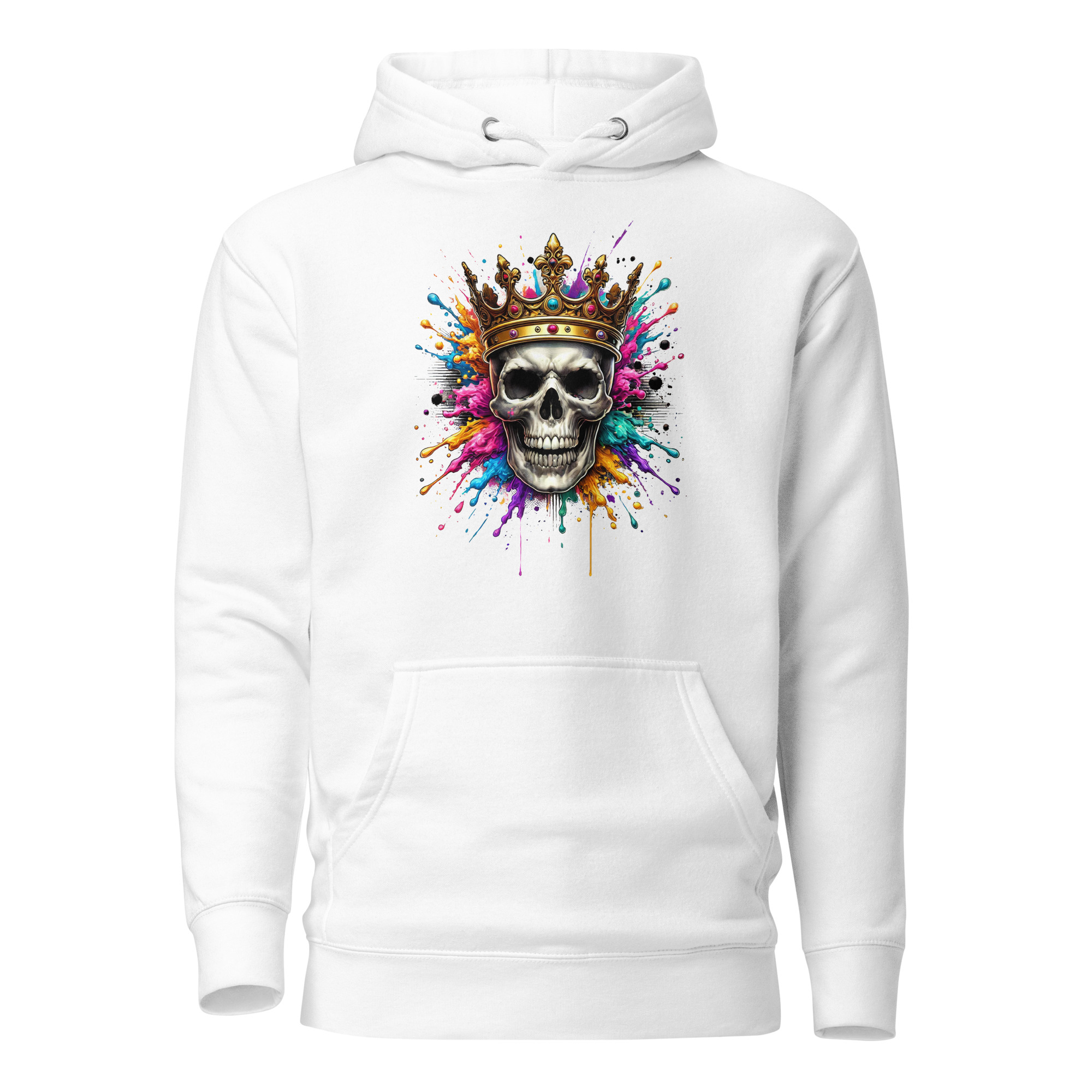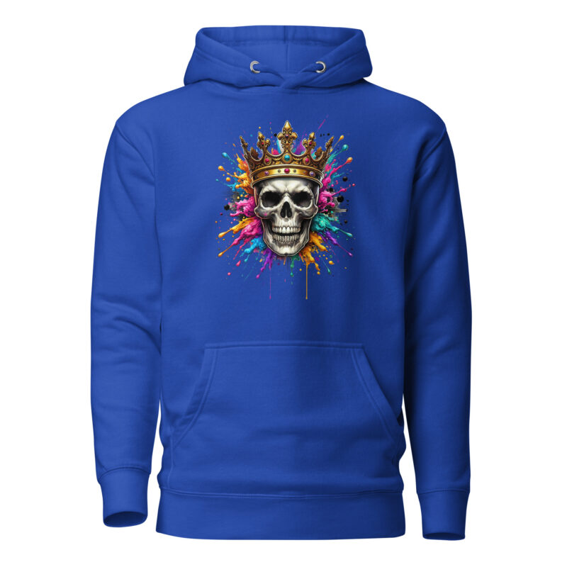 Dieses kraftvolle Design kombiniert einen detailreichen Schädel mit einer prachtvollen, edelsteinbesetzten Krone und einem explosiven Hintergrund aus bunten Farbspritzern. Der Kontrast zwischen dem symbolischen Tod und der lebendigen Farbpalette macht dieses Motiv zu einem wahren Kunstwerk voller Dynamik und Rebellion. Perfekt für dich, wenn du eine Vorliebe für majestätische, aber auch provokative Designs hast und gerne ein Statement setzt, das sowohl Stärke als auch Kreativität ausstrahlt. Der Schädel mit Krone verkörpert eine Mischung aus Macht und Vergänglichkeit – ein echter Hingucker für alle, die es farbenfroh und ausdrucksstark lieben!