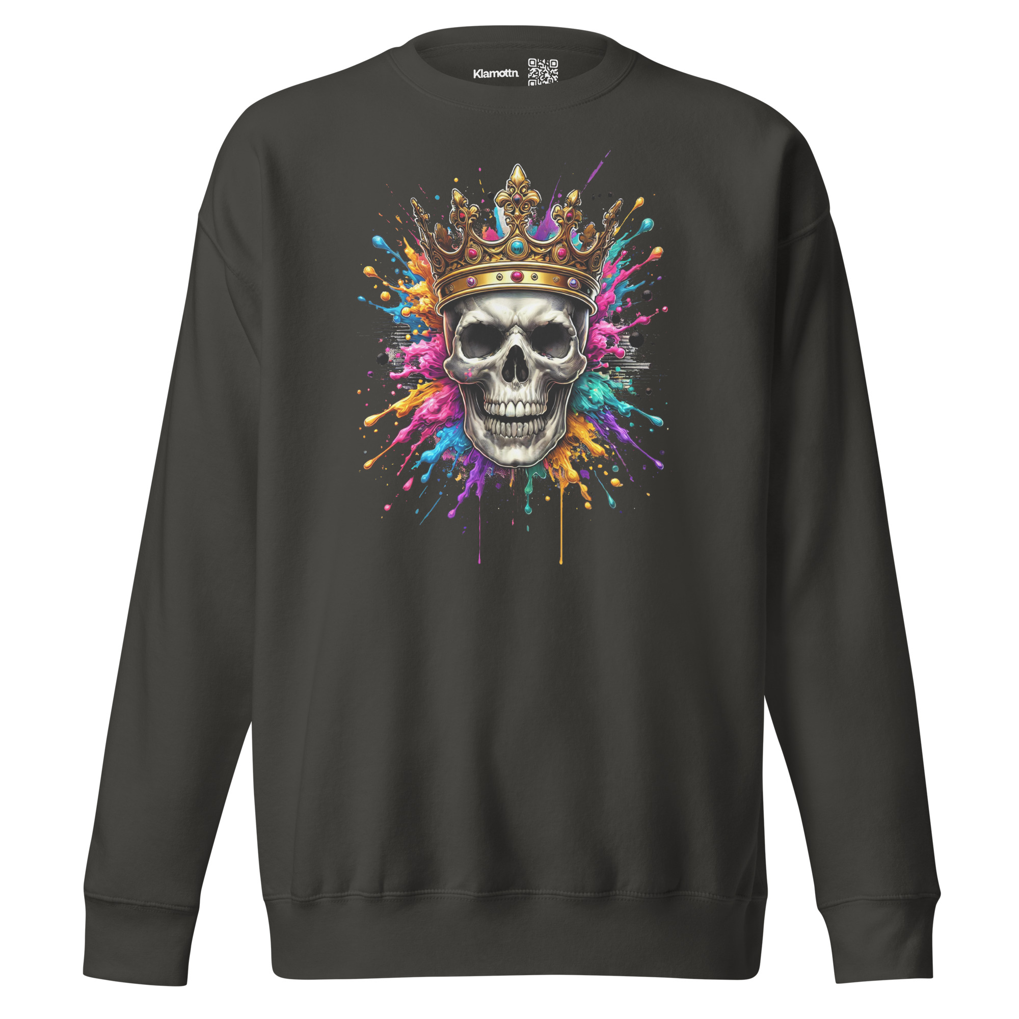 Dieses kraftvolle Design kombiniert einen detailreichen Schädel mit einer prachtvollen, edelsteinbesetzten Krone und einem explosiven Hintergrund aus bunten Farbspritzern. Der Kontrast zwischen dem symbolischen Tod und der lebendigen Farbpalette macht dieses Motiv zu einem wahren Kunstwerk voller Dynamik und Rebellion. Perfekt für dich, wenn du eine Vorliebe für majestätische, aber auch provokative Designs hast und gerne ein Statement setzt, das sowohl Stärke als auch Kreativität ausstrahlt. Der Schädel mit Krone verkörpert eine Mischung aus Macht und Vergänglichkeit – ein echter Hingucker für alle, die es farbenfroh und ausdrucksstark lieben!