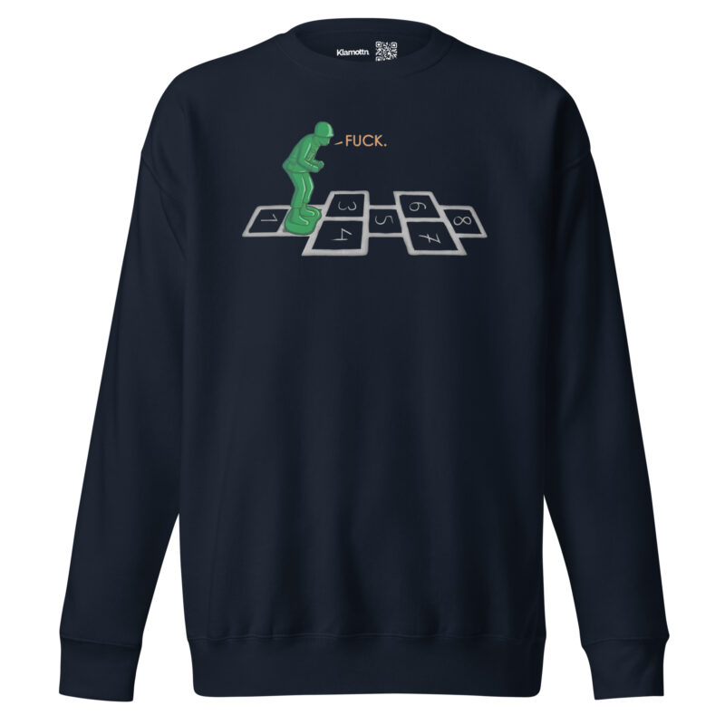 Dieses Design ist einfach genial für alle, die schwarzen Humor und kreative Ironie lieben! Hier steht ein Spielzeugsoldat vor der Herausforderung eines Hüpfspiels, aber mit einem kleinen Problem: Seine Beine lassen sich nicht auseinander bewegen, um auf die nebeneinanderliegenden Felder zu springen. Das sarkastische „Fuck“ bringt seine Frustration perfekt auf den Punkt und sorgt für einen witzigen Moment, der garantiert für Lacher sorgt. Perfekt für dich, wenn du es liebst, Kontraste zwischen Ernsthaftigkeit und kindlicher Unschuld darzustellen – dieses Design vereint Humor und Ironie auf eine originelle Weise. Ein Muss für alle, die ihren Humor gern etwas anders ausdrücken!