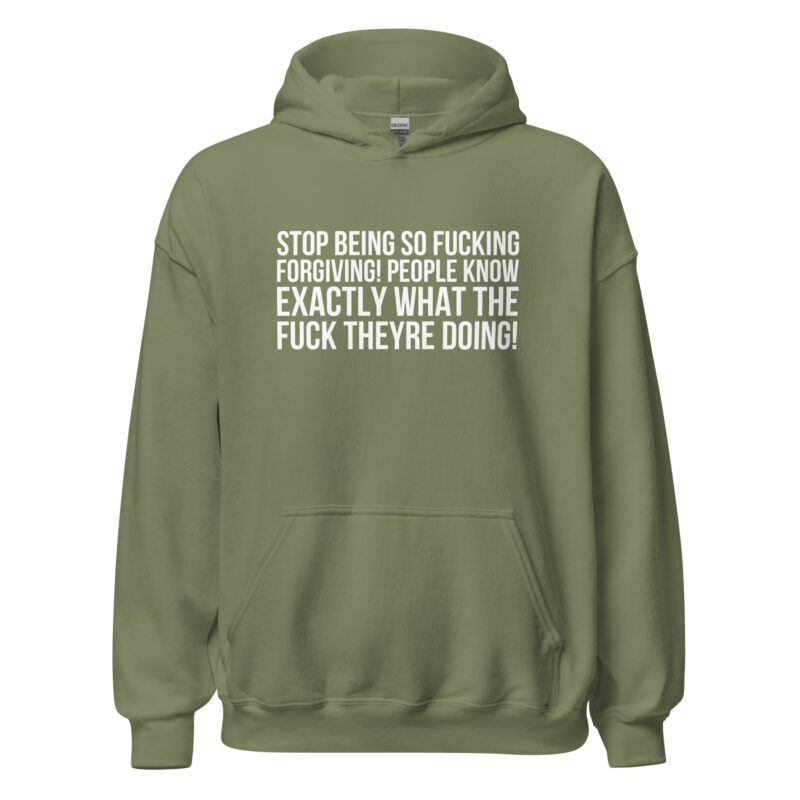 Zeit, Klartext zu sprechen! Mit diesem Design zeigst du allen, dass du keine Ausreden mehr akzeptierst. Der Spruch „Stop being so fucking forgiving! People know exactly what the fuck they’re doing!“ bringt es gnadenlos auf den Punkt und lässt keinen Raum für Schönreden. Wenn du es liebst, provokante Statements zu setzen und keine Geduld mehr für leere Entschuldigungen hast, ist das genau dein Ding. Schnapp dir dieses Design und mach deutlich, dass du ehrlich und direkt bist – ohne Kompromisse!