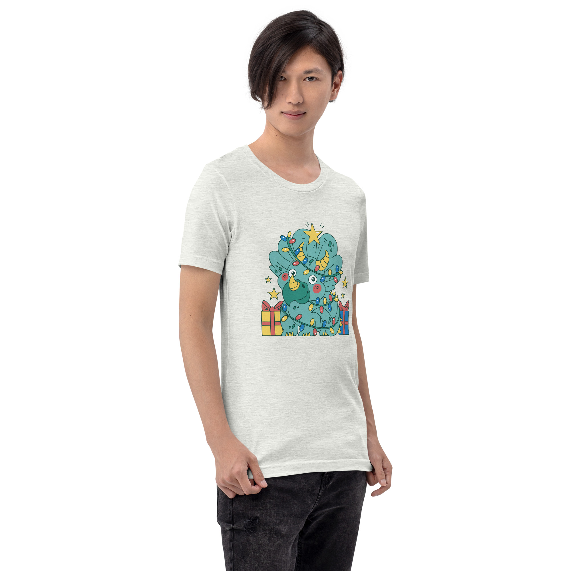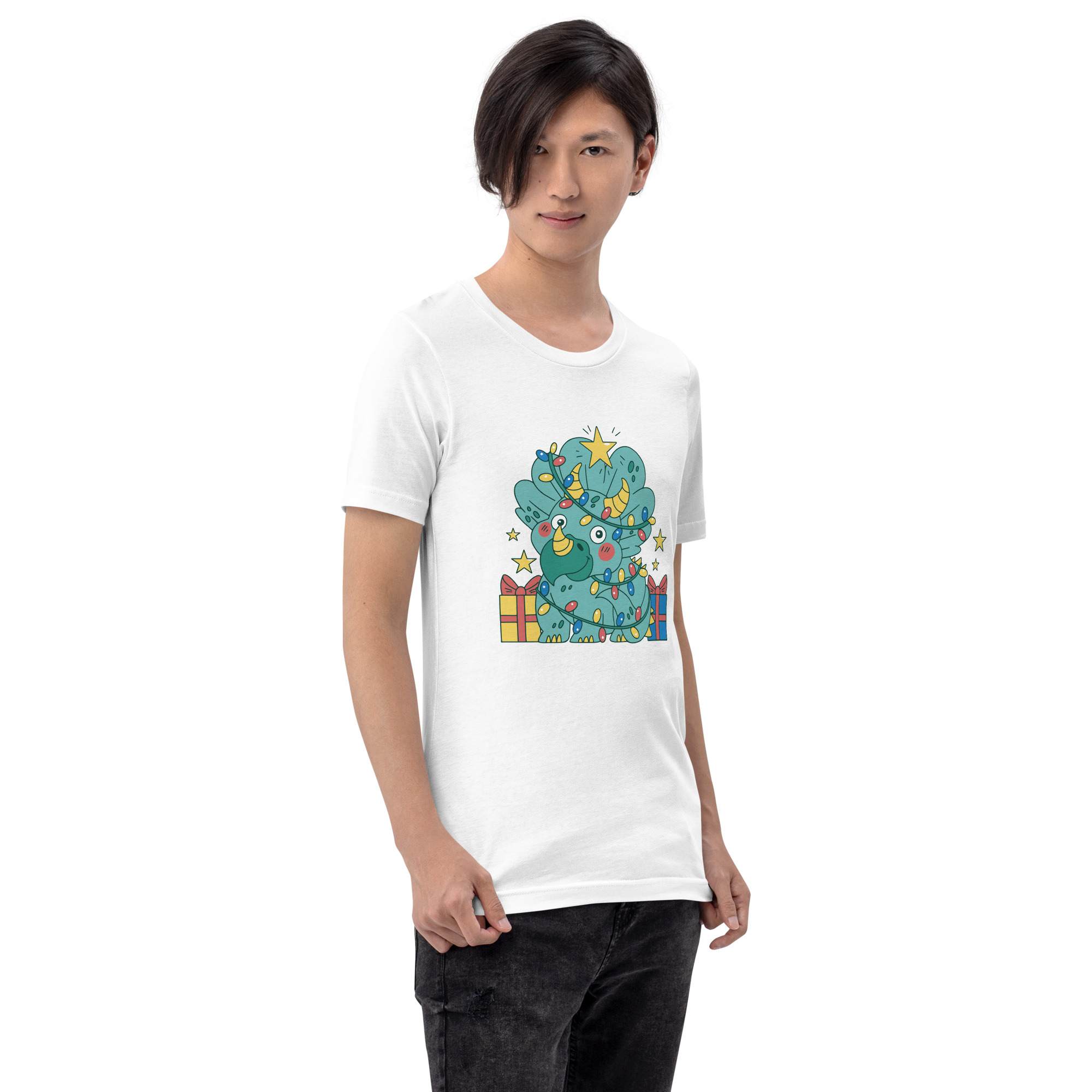 Ein Design eines Triceratops, der mit weihnachtlichen Elementen verziert ist. Der Dinosaurier ist in Grüntönen gehalten und mit einer Lichterkette aus bunten Glühbirnen umwickelt. Auf seinem Kopf sitzt ein gelber Stern. Seine drei charakteristischen Hörner sind gelb gefärbt, was ihnen ein kerzenähnliches Aussehen verleiht. Der Triceratops hat rosige Wangen und ein freundliches Lächeln. Vor ihm befinden sich zwei Geschenkpakete mit roten Schleifen. Dieses Triceratops im Weihnachtsbaum-Look Produkt ist von klamottn erstellt.
