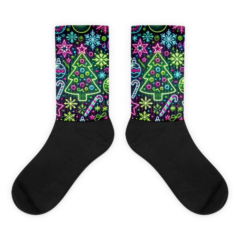 Diese Socken sind dank ihres gepolsterten Bodens besonders bequem. Der Fuß ist schwarz. Der Druck ist entlang des Beins mit klaren, kräftigen Farben, die nicht verblassen.