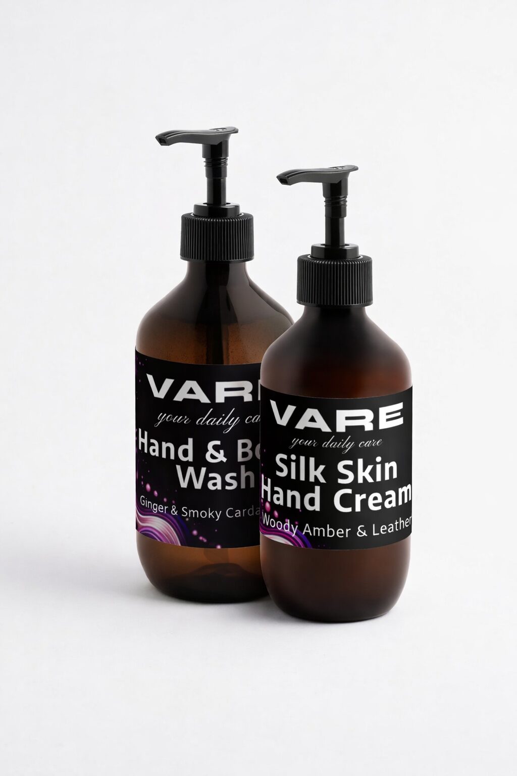 Das VARE Daily Care Set – Ginger & Smoky Cardamom kombiniert sanfte Reinigung mit pflegender Handpflege für den täglichen Gebrauch. Das Hand & Body Wash reinigt Hände und Haut schonend und hinterlässt ein klares, gepflegtes Hautgefühl mit einem warmen, würzigen Duft aus Ingwer und rauchigem Kardamom. Ergänzt wird das Set durch die Silk Skin Hand Cream Woody Amber & Leather, die beanspruchte Hände intensiv mit Feuchtigkeit versorgt, schnell einzieht und die Haut geschmeidig pflegt. Gemeinsam bilden beide Produkte eine unkomplizierte Pflegeroutine für jeden Tag. Als Teil der VARE-Pflegelinie ist dieses Set exklusiv bei klamottn.de erhältlich.