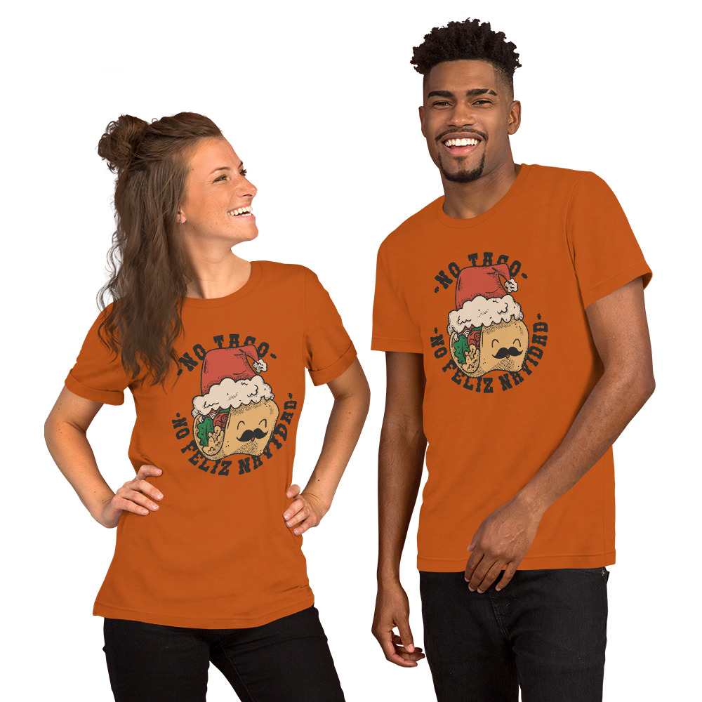 Ein humorvolles und festliches Design, das einen Taco mit einem Gesicht und einem Schnurrbart darstellt, der eine rote Weihnachtsmütze trägt. Innerhalb des Tacos finden sich typische Füllungen wie Salat und Tomaten. Ringsherum sind die Worte “No Taco – No Feliz Navidad” in einem kreativen, Schriftstil platziert. Das Design kombiniert die Weihnachtszeit mit der Beliebtheit und Einzigartigkeit von Tacos. Ein perfekter Ausdruck für alle, die Essen und Feiertage lieben.